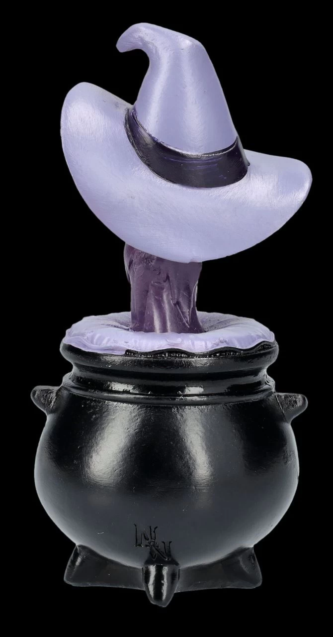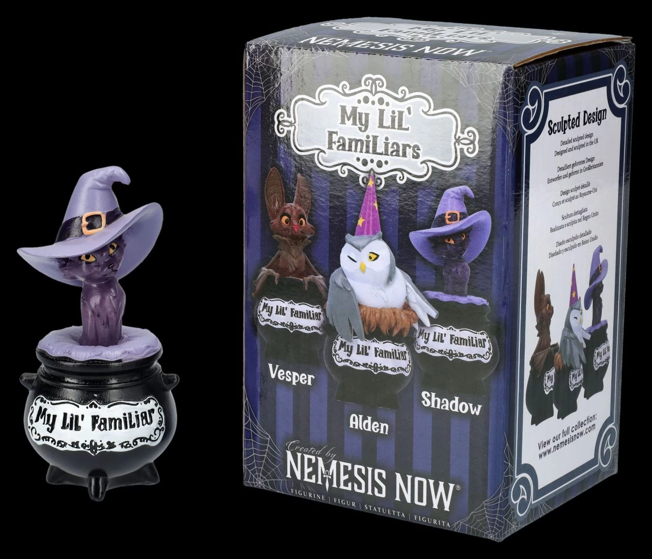 ‚My Lil‘ Familiar‘ steht auf dem schwarzen Hexenkessel, auf dem die violette Katze Shadow beinahe unter dem violetten Hexenhut verschwindet. Die lustige Katzen-Figur von Nemesis Now ist aus handbemaltem Kunststein (Polyresin) und 10,5 cm hoch, 5 cm breit und 5 cm tief. Die Katze Shadow ist – am besten gleich gemeinsam mit den anderen Familienmitgliedern, der Fledermaus Vesper und der Eule Alden aus unserem Shop – eine witzige Deko und ein perfektes Geschenk für große und kleine Hexen, Magier und Sammler und kommt mit einem toll bedruckten Geschenkkarton.