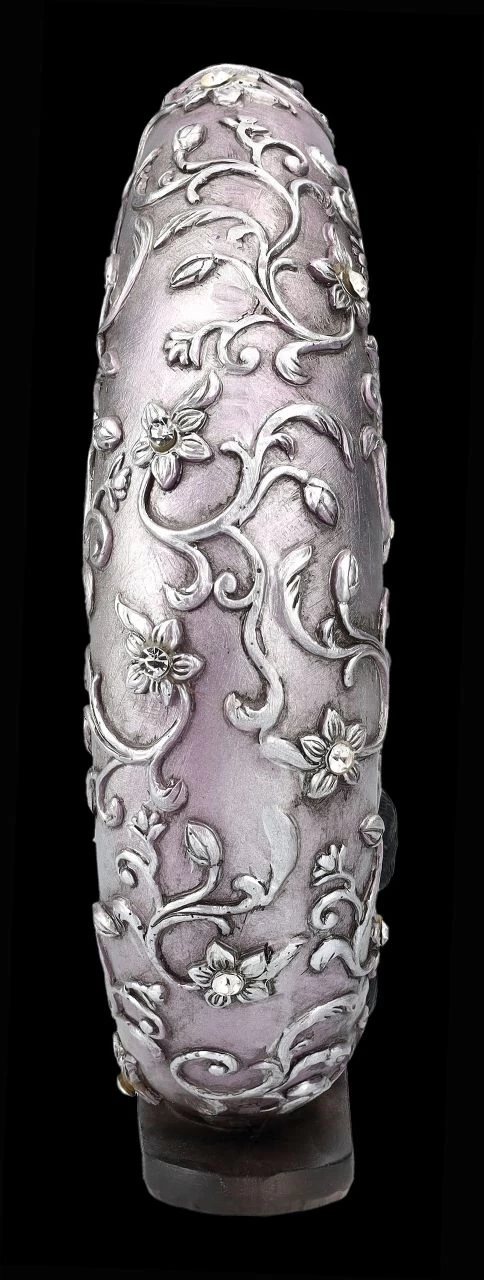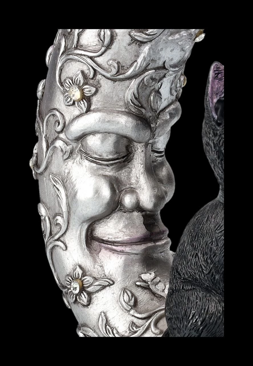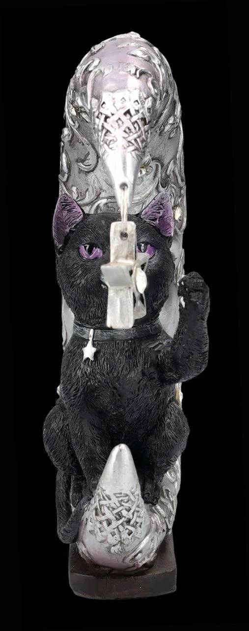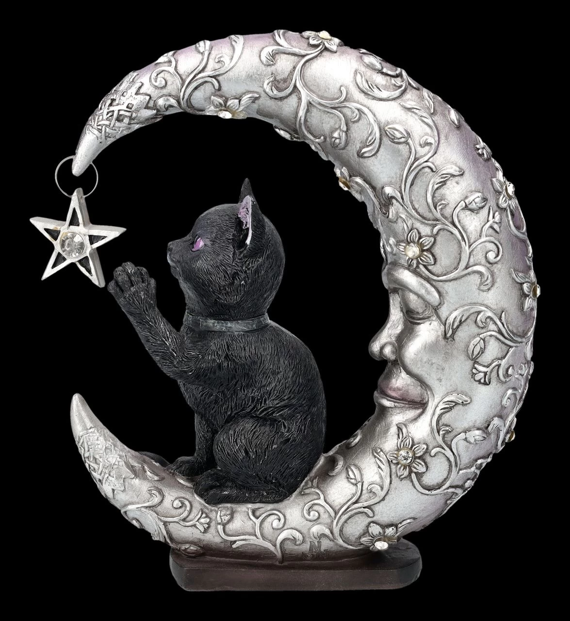 Da beide eher in der Nacht aktiv sind, kennen sie sich natürlich schon sehr gut. Daher kann man nicht sicher sein – lächelt der silberne Mond, weil die kleine schwarze Katze so süß mit dem Pentagramm spielt, oder ist er dabei in Trance geraten? Nicht nur die silbern glänzende, mit Blumenranken umschlungene Mondsichel ist mit Schmucksteinen verziert, auch das Pentagramm hat einen glitzernden Schmuckstein in der Mitte. Die 19,5 cm hohe, 16 cm breite und 5 cm tiefe Mondsichel mit dem Pentagramm und der schwarzen Katze wurde aus liebevoll handbemaltem Kunststein (Polyresin) gefertigt. Eine absolut niedliche Deko und das perfekte Geschenk für alle, die sich von Luna Companion in süße Träume begleiten lassen möchten.