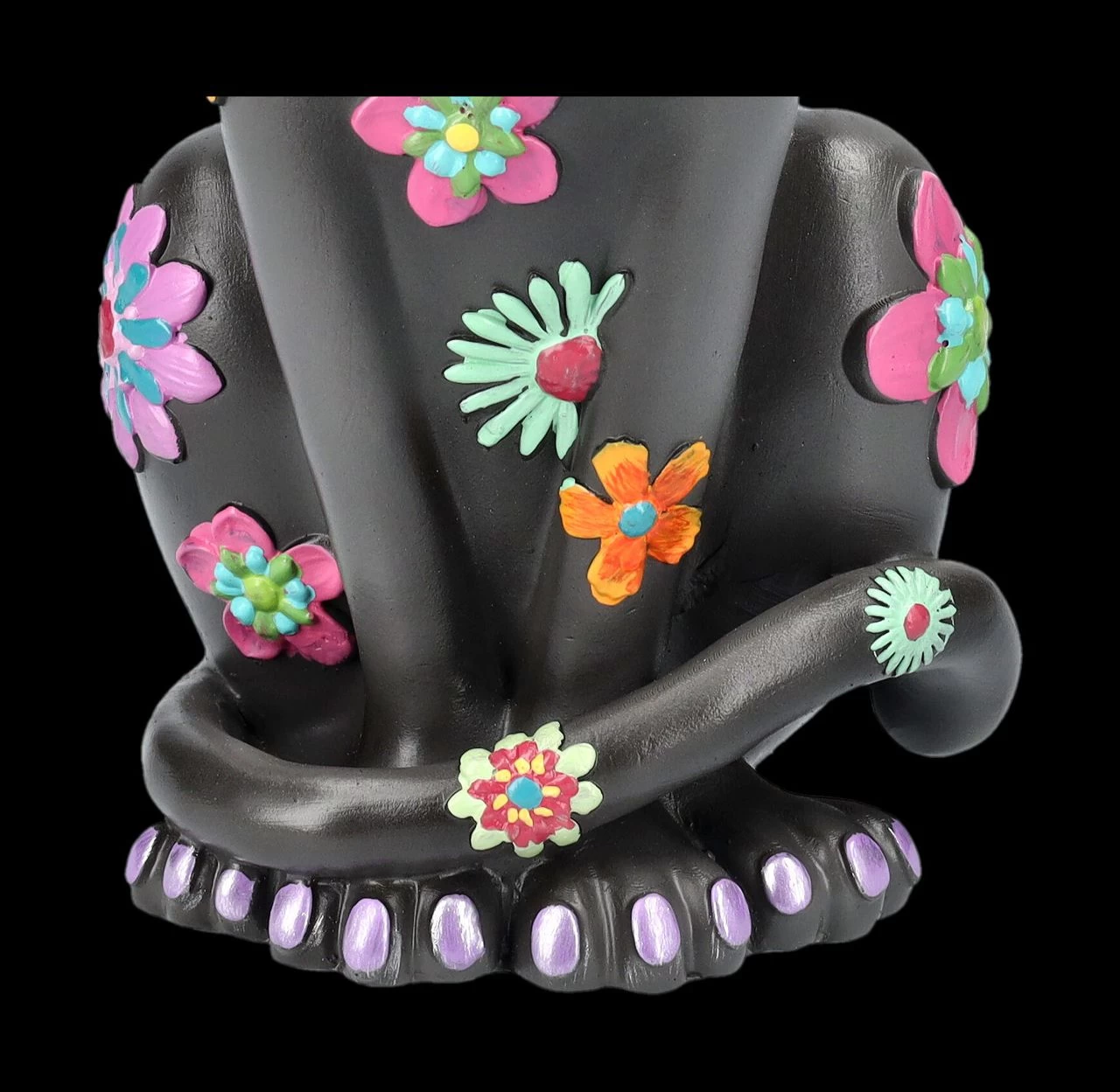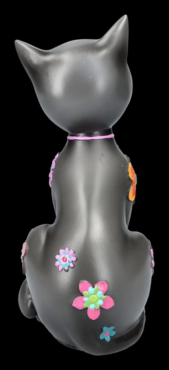 Auch unter Hexen gibt es Hippies und da ist es wohl selbstverständlich, wenn sie sich von ihrer Flower Power Katze mit Peace Halskette begleiten lassen. Die hustige schwarze Hippy Kitty ist 26 cm hoch, 10,5 cm breit und 11 cm tief. Die hübsche, mit bunten Blumen geschmückte Katze mit dem neckischen Blick ist garantiert nicht zu übersehen und sollte einen wunderbaren Platz bekommen. Sie wurde aus liebevoll handbemaltem Kunststein (Polyresin) gefertigt und ist ein wunderbares Geschenk nicht nur für lustige Hexen, sondern für jeden, der Katzen bewundert.
