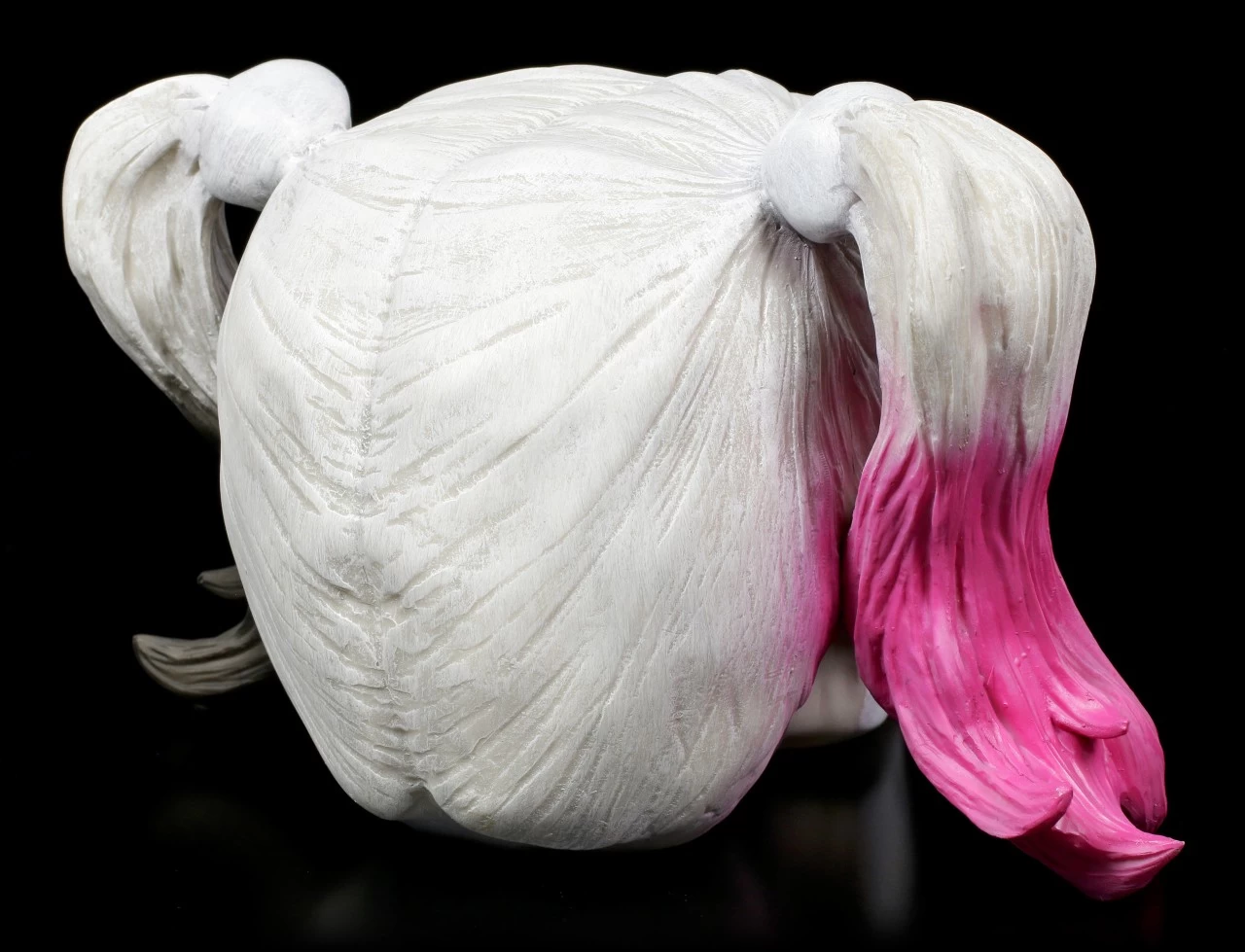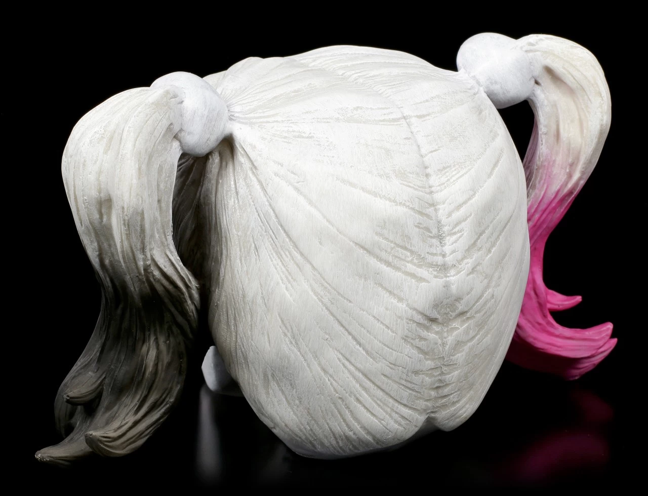 Dieses kleine Monster ist perfekt für Halloween! Besonders auffallend bei diesem schwarz-pink geschminkten weißen Totenschädel ist die weiße Haarpracht, die in zwei seitlichen Pferdeschwänzen gebändigt worden ist. Die pink gefärbten Haarspitzen leuchtet schon von weitem. Dieser Totenkopf aus handbemaltem Kunststein (Polyresin) sieht so unschuldig frech aus – wer kann diesem little Monster schon widerstehen?
