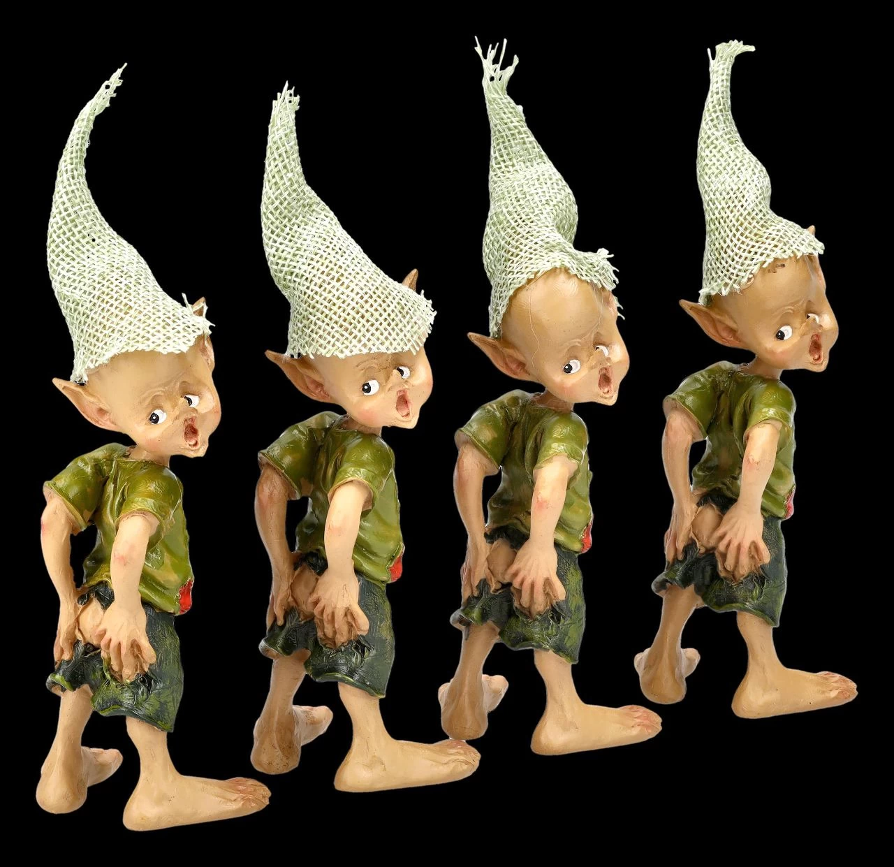 Oh Mann, was hat die freche Bande da wieder angestellt? Die Mutter der vier Frechdachse wird sich vermutlich nicht gerade freuen, wenn sie die zerrissenen Hosen entdeckt. Mit beiden Händen versuchen die kleinen Pixie Kobolde das große Loch in ihrer Hose zu verdecken. Die witzigen Pixie Kobolde wurden aus liebevoll handbemaltem Kunststein (Polyresin) gefertigt und sind je 13 cm hoch, je 4 cm breit und je 5,5 cm tief. Sie kommen im 4er Set und sind für jeden Pixie-Sammler ein richtig niedliches Geschenk und können vielleicht auch gleich mit Freunden geteilt werden. Sammler finden übrigens in unserem Shop weitere lustige Pixie-Figuren.