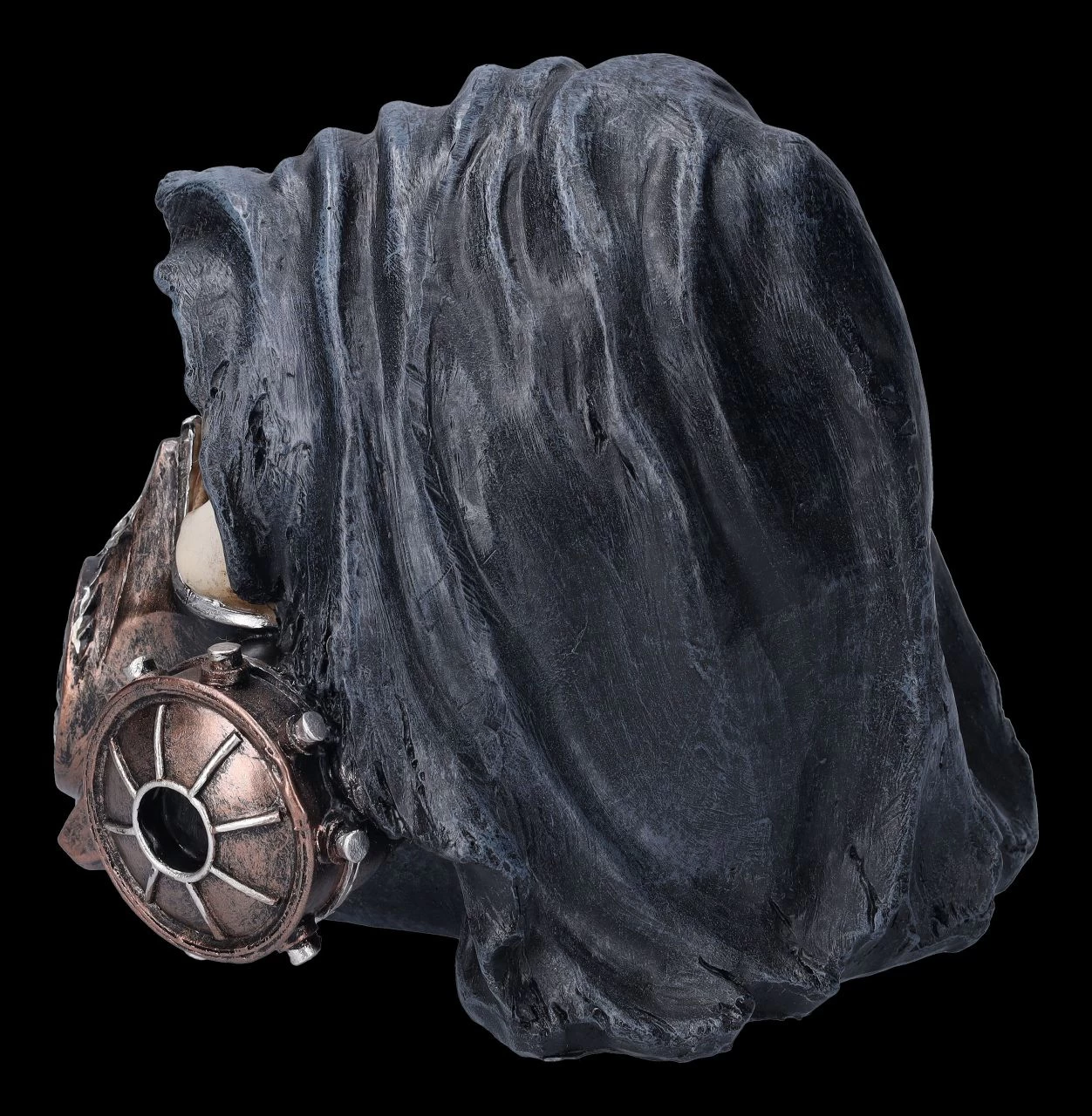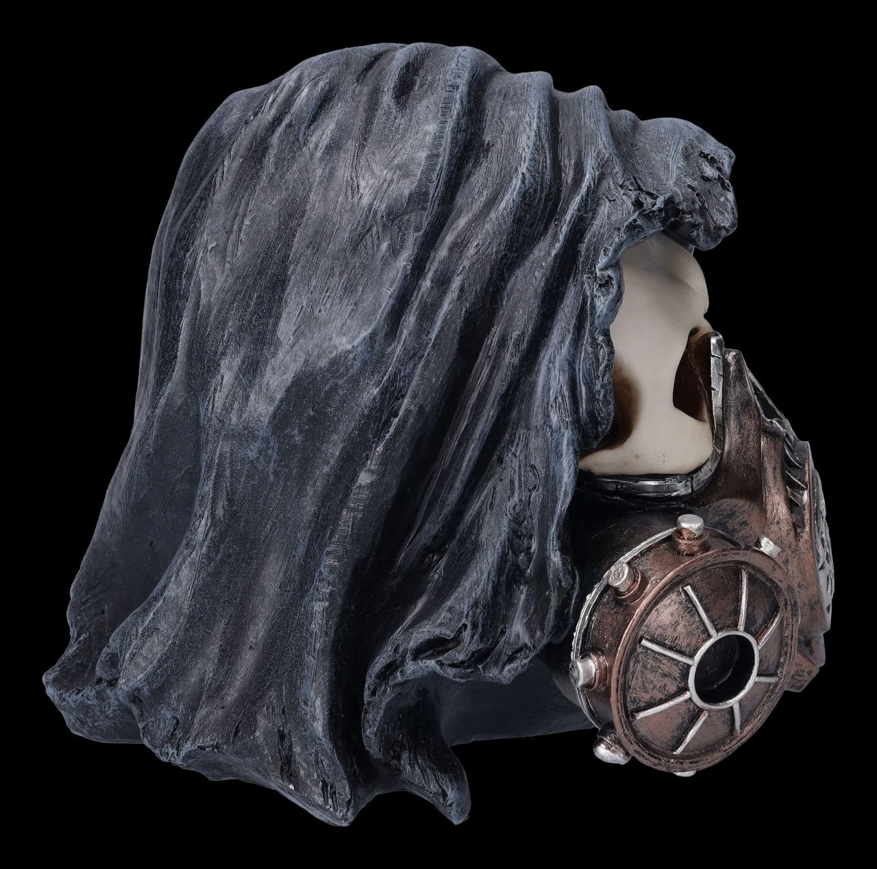 Damit er nicht jedem seinen Pesthauch ins Gesicht bläst, wurde er mit einer stabilen Gasmaske ausgestattet – der Reaper Totenschädel mit der schwarzen Kapuze. Catch Your Breath wäre manchmal nicht nur für den Reaper hilfreich. Der witzige, 17 cm hohe, 16 cm breite und 19 cm tiefe Reaper Totenkopf wurde bis zu den technischen Details der Gasmaske aus Kunststein (Polyresin) gefertigt und sorgsam handbemalt. Er ist ein – vielsagender – Blickfang auf jedem Schreibtisch.