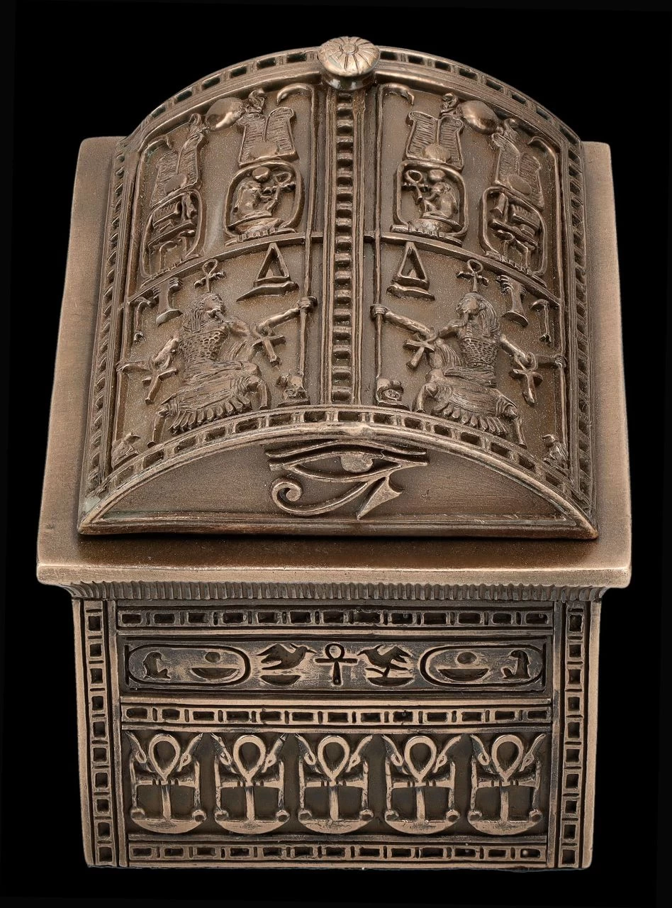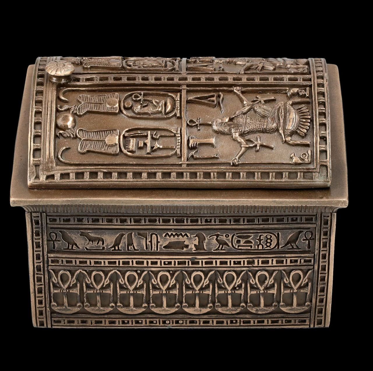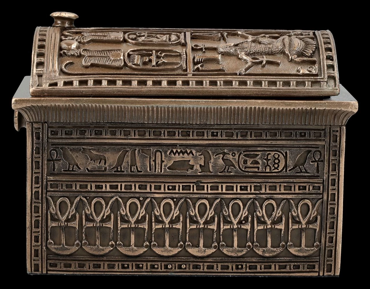 Schränke oder andere Möbel kannte man im alten Ägypten noch nicht. So wurde – wie man auch aus Grabbeigaben kennt – alles in Krügen, Körbe, Tüchern oder Kästchen verstaut. Die konnte man dann auch ganz leicht mitnehmen. Aber auch als Kanopenkasten wurden die oft wie richtige Kunstwerke verzierten Truhen verwendet. Die 9 cm hohe, 9 cm breite und 11,5 cm tiefe handbemalte und mit Hieroglyphen verzierte Schatulle in Form einer Ägyptischen Truhe ist detailreich aus Kunststein (Polyresin) gefertigt. Im Inneren hat sie mit H: 5,5 cm / B: 6,5 cm / T: 9,5 cm ausreichend Platz für besondere Kleinigkeiten und sie ist auch ein perfektes Geschenk für alle, die sich für das Alte Ägypten interessieren.