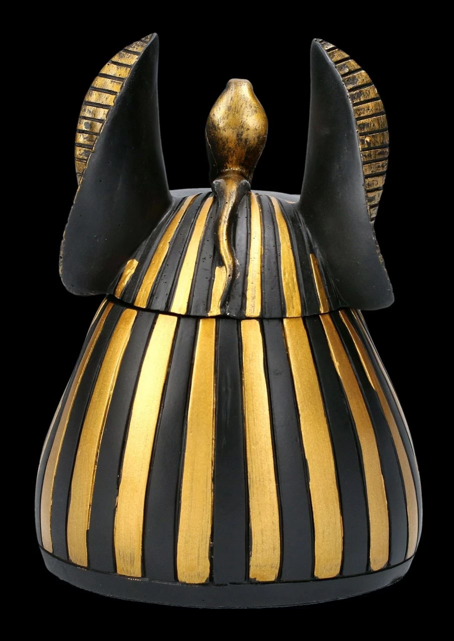 Nicht nur für alle Ägypten Fans ist diese faszinierende Schatulle mit dem schakalförmigen Kopf des Mumifizierung- und Totengottes Anubis eine wunderbare Aufbewahrung für ganz besondere und persönliche Dinge. Nach der ägyptischen Mythologie beschützt Anubis als kosmische Gottheit das Totenreich. Die faszinierende, 14 cm hohe, 10 cm breite und 14 cm tiefe Schatulle hat innen mit den Maßen von H: 7cm x B: 4,5 cm x T: 6 cm auch Platz für wichtige Erinnerungen oder auch für ein besonderes Geschenk. Die dekorative Schatulle ist detailreich aus Kunststein (Polyresin) gefertigt und edel in Schwarz mit goldenen Akzenten handbemalt.