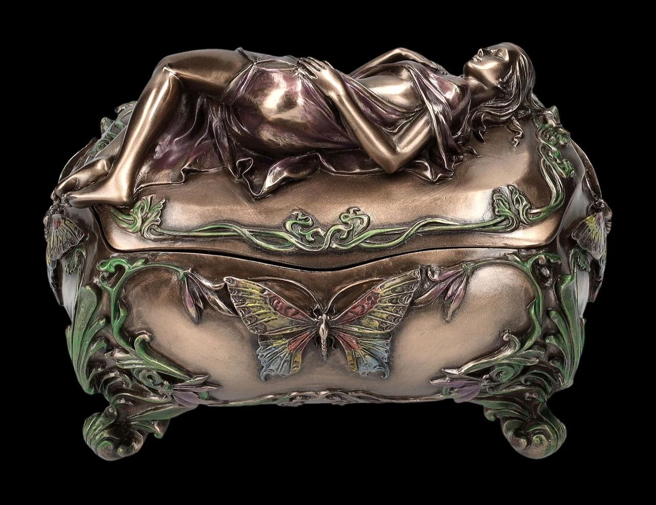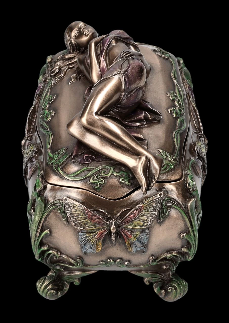 Diese wunderbare Schatulle aus der Studio Collection von Veronese im Art Nouveau Stil wird absolut jeden begeistern. Auf dem Deckel der herrlich verzierten, 11 cm hohen, 15 cm breiten und 10 cm tiefen Schatulle ruht in graziöser Haltung eine wunderschöne junge Frauengestalt. Die Schatulle wurde sehr detailreich aus Kunststein (Polyresin) gefertigt und edel bronziert und sehr fein und zurückhaltend coloriert. Egal wo sie hingestellt wird, diese unglaublich dekorative Schatulle wird sicher alle Blicke auf sich ziehen. Mit den Innenmaßen von H 5 cm x B 12,5 cm x T 7 cm ist sie aber auch eine prächtige Verpackung für ein ganz besonderes Geschenk.