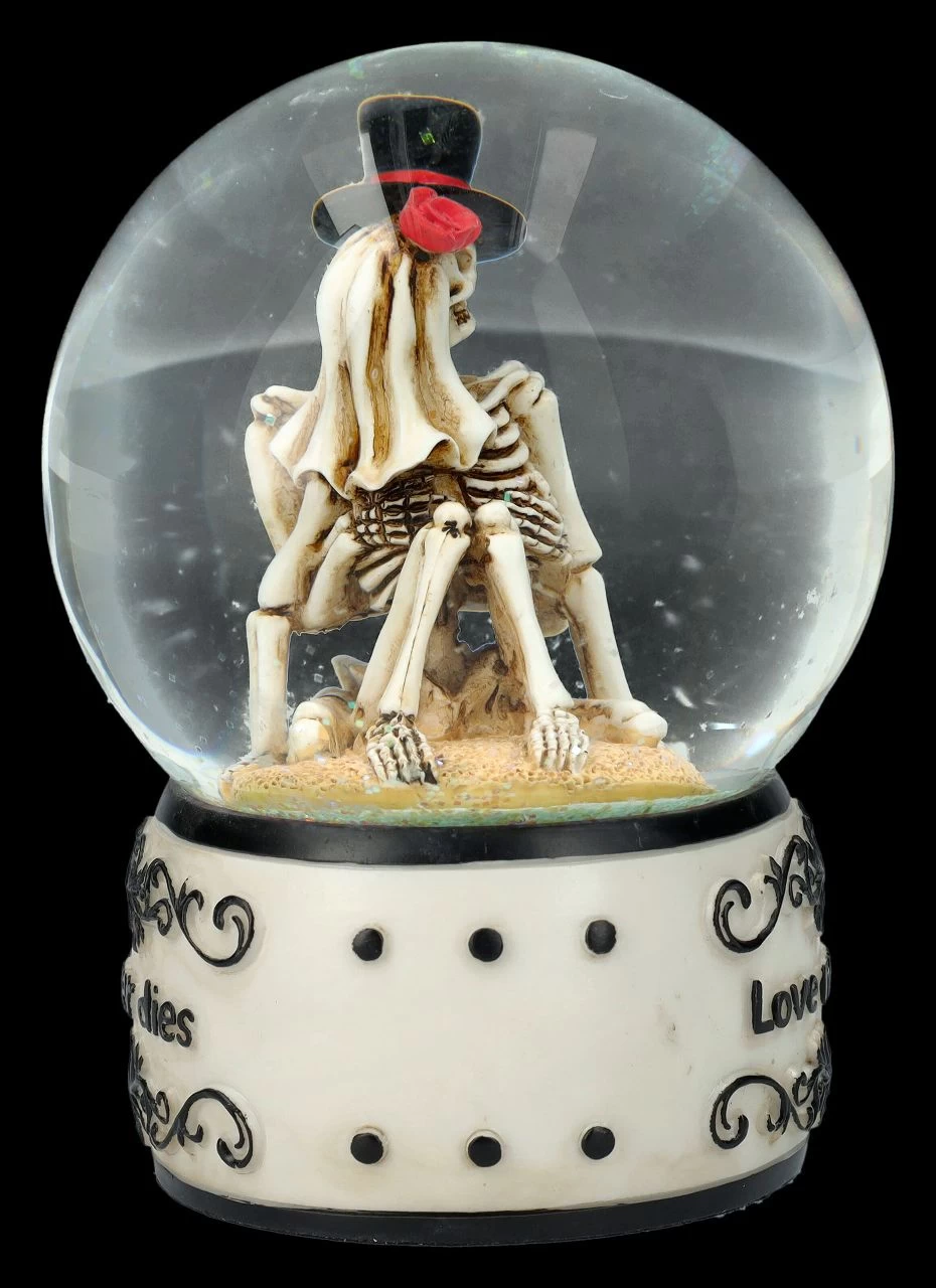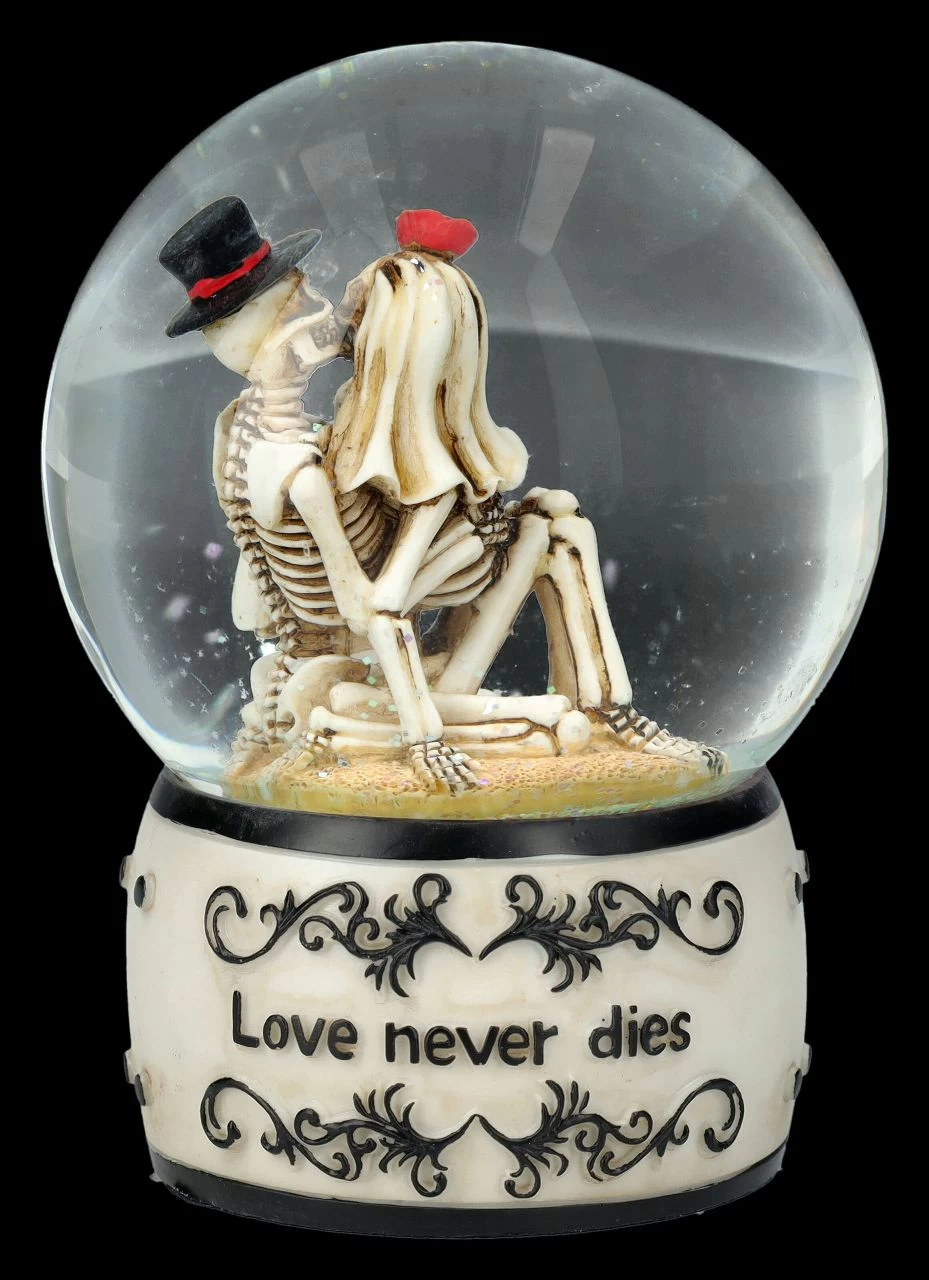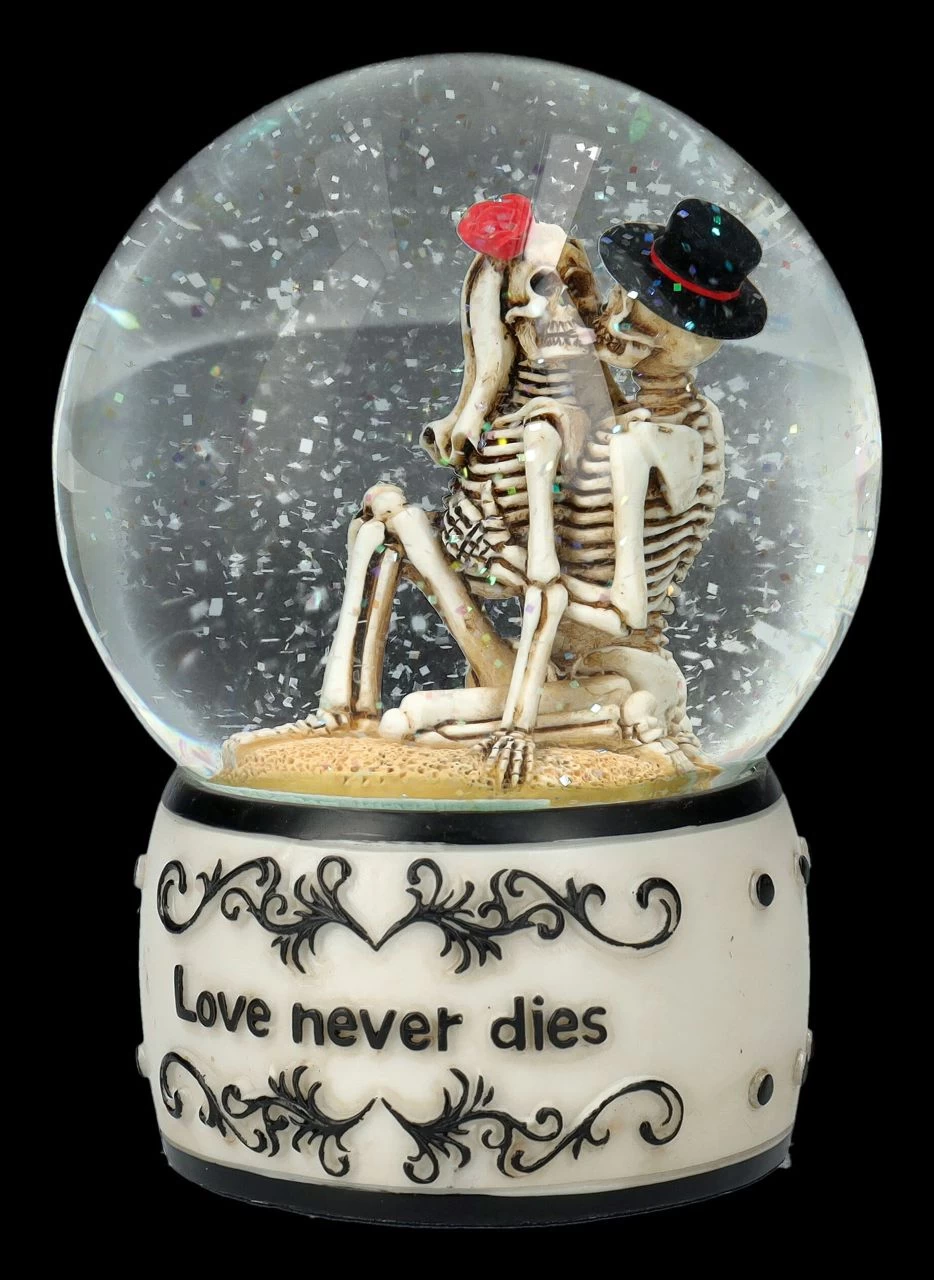 ‚Love never dies‘, also ‚Wahre Liebe stirbt nie‘ steht nicht nur in schwarzen Lettern auf auf dem schön verzierten weißen Sockel, auch das Skelettpaar in der Schneekugel beweist es. Ob das Glas der Schneekugel nun durchscheinend ist, oder der Schnee herumwirbelt – sie lassen sich bei ihrem Liebesspiel nicht stören. Bis zur roten Rose in ihrem Haar und seinem schwarzen Zylinder mit rotem Band sind die beiden, wie auch der Sockel, detailreich aus handbemaltem Kunststein (Polyresin) entstanden. Die 13,5 cm hohe, 10 cm breite und 10 cm tiefe wunderbare Schneekugel mit dem sich zärtlich küssenden Skelettpaar ist als Liebesbeweis ein perfektes Geschenk für die oder den Liebsten.