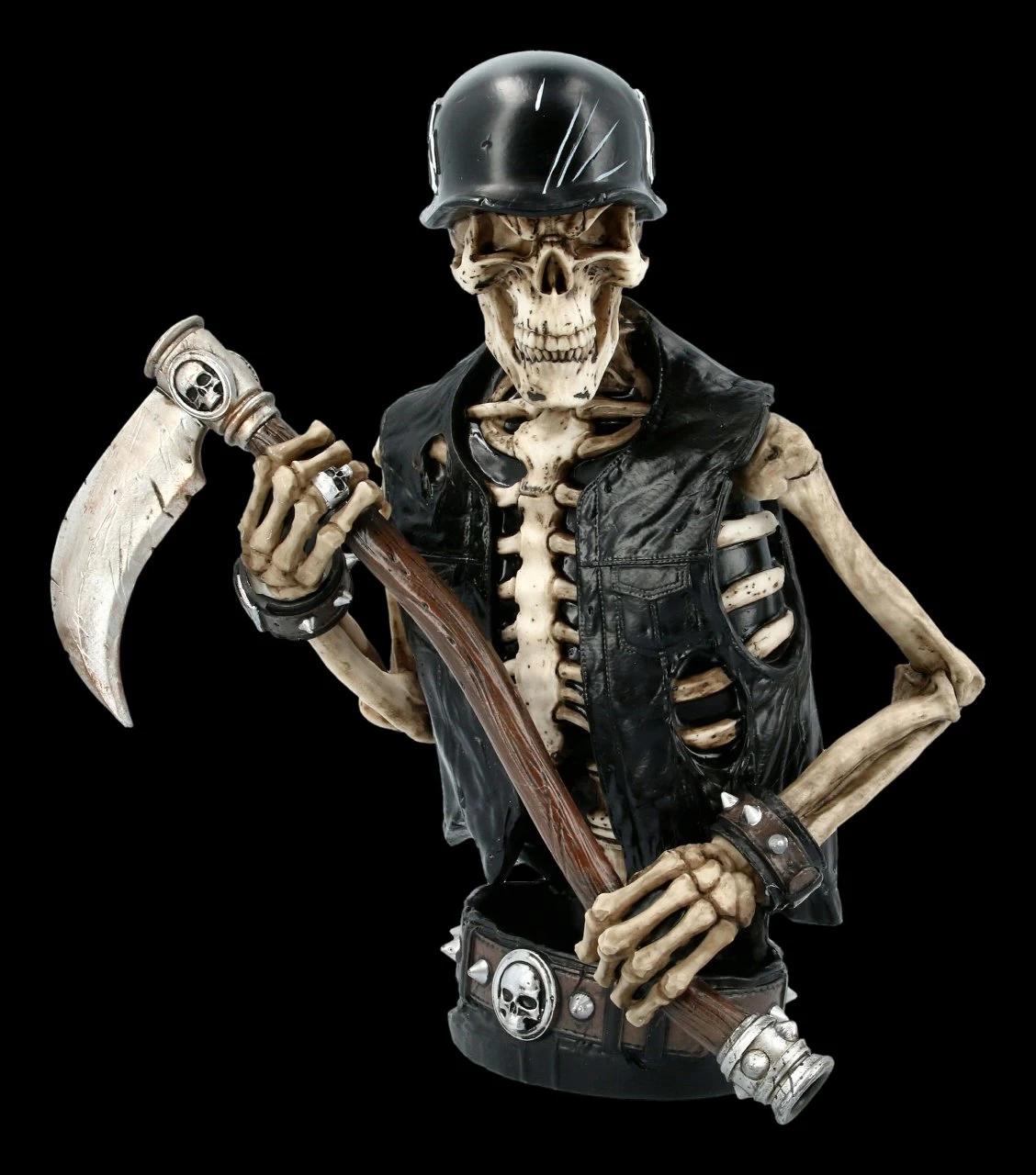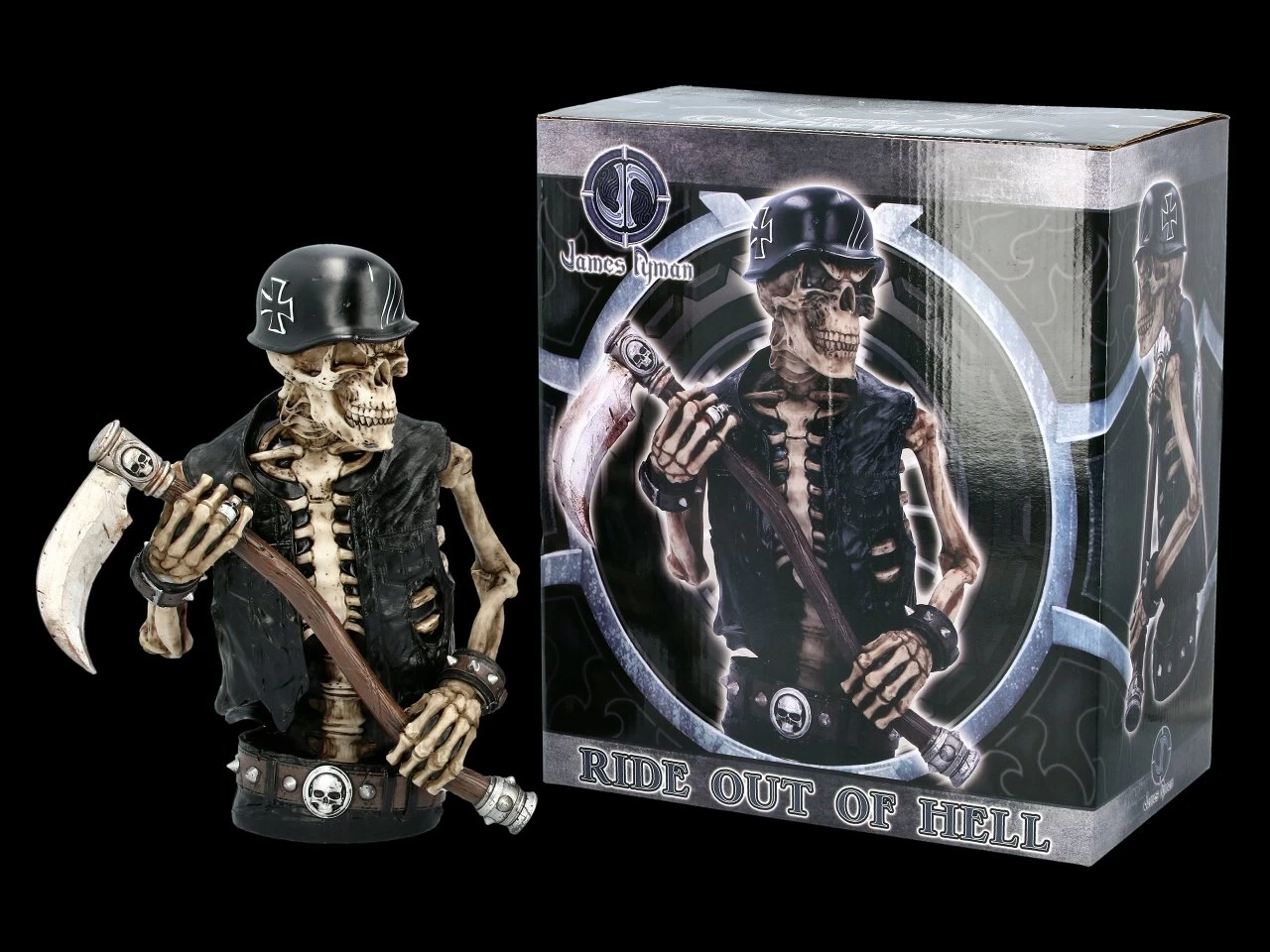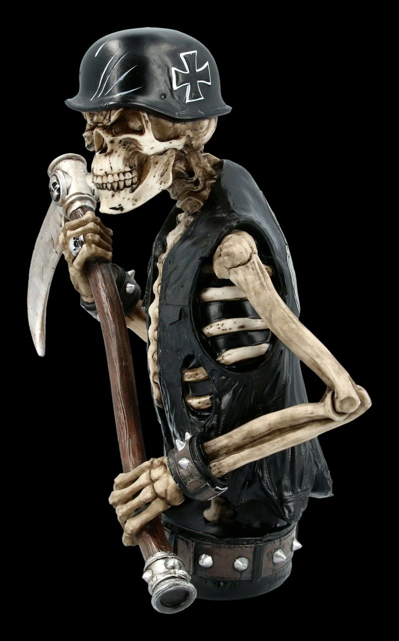 Ziemlich cool, aber durchaus auch etwas makaber ist diese von dem Künstler James Rymann geschaffene Skelett Figur ‚Ride out of Hell‘. Der Biker mit der Sense ist außerordentlich detailreich aus sorgsam handbemaltem Kunststein (Polyresin) gefertigt. Er hat eine Höhe von 28 cm, eine Breite von 22 cm und eine Tiefe von 14 cm. Er ist – eventuell auch als Mahnung – ein tolles und interessantes Geschenk für alle Biker und kommt inklusive einer Geschenkbox. Der Biker mit der Sense passt aber auch perfekt als coole Deko in jede Werkstatt oder die Garage.