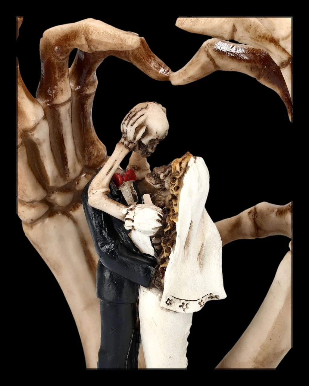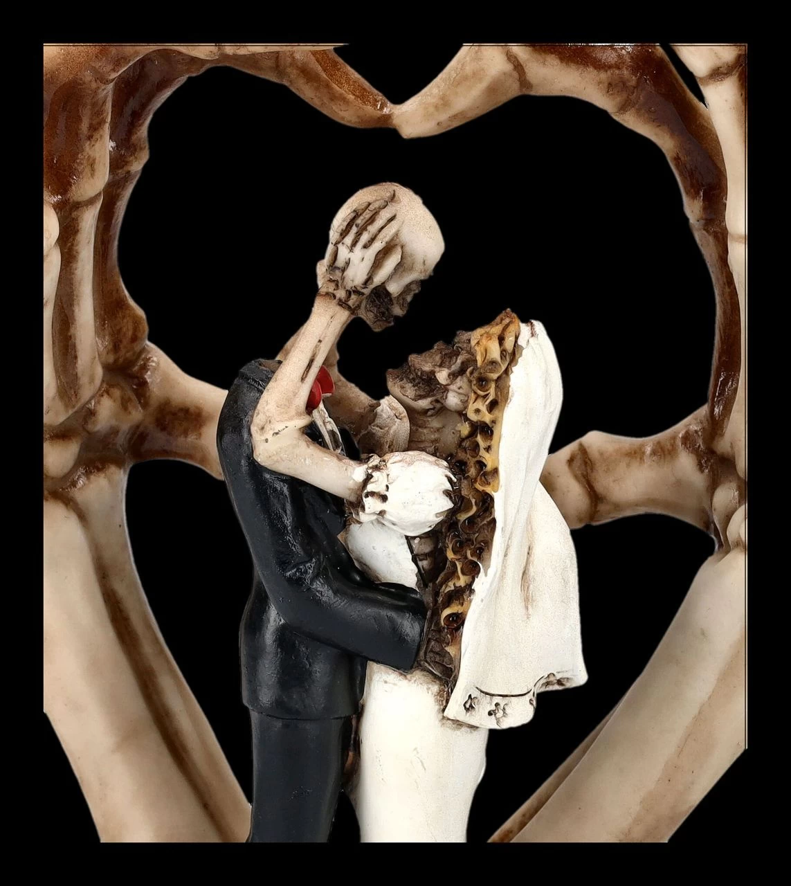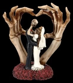 Das nennt man dann wohl ‚Kopf verloren‘ – und das über den Tod hinaus – und dann auch noch auf Rosen gebettet… Skeletthände bilden ein herzförmiges Tor über dem Skelett-Brautpaar. Die Braut hält den vom Körper getrennten Kopf ihres Bräutigams hoch erhoben in ihren Händen. ‚From This Day Forward‘ heißt diese 19,5 cm hohe, 17,5 cm breite und 11,5 cm tiefe Skelett-Figur mit dem Brautpaar. Das ist doch mal eine ganz andere Deko für einen Hochzeitstisch.