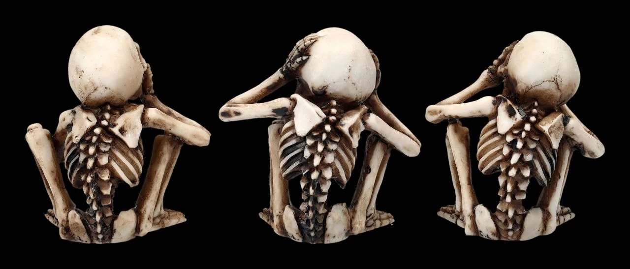 Also echt – da taucht man aus der Versenkung auf und muss schon beweisen, dass man nichts Böses hören, sehen und auch nicht sagen möchte. Ist das denn zu glauben…. Die lustigen hockenden Skelettchen kommen im 3er Set. Sie sind 8,5 – 9 cm hoch, 8 – 9 cm breit und 5,5 – 6 cm tief. Die Skellingtons wurden detailreich aus Kunststein (Polyresin) gefertigt und sind handbemalt. Sie sind – nicht nur an Halloween – ein toller Hingucker auf jedem Schreibtisch.