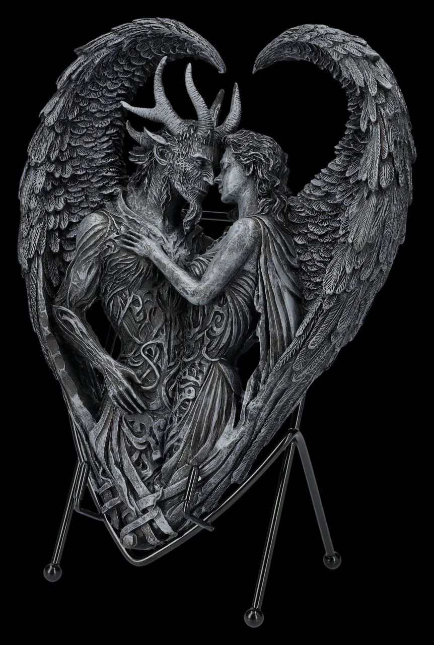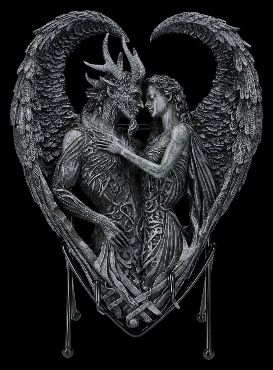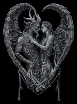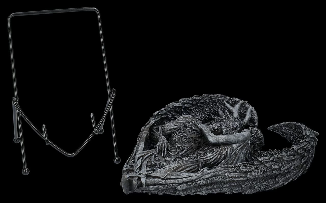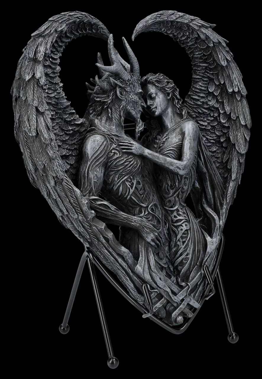 ‚Gegensätze ziehen sich an‘ – so könnte man dieses fantasievolle Deko-Relief ‚Solemn Vow‘ mit dem Dämonen und dem Engel von Spiral auch bezeichnen. Aber wer sagt denn, dass ein Dämon nicht auch zärtliche Gefühle haben kann und ein Engel eine dunkle Seite? Außerdem: Zeigt der Dämon mit den Hörnern und den Verästelungen auf seinem durchtrainierten Körper nicht auch seine Verbindung zur Natur – warum soll dann nicht eine Verbindung mit einem schönen Engel möglich sein? ‚Solemn Vow‘ – also ein ‚Feierliches Gelübde‘ legen die beiden so konträren Figuren bei Spiral ab. Die großen Flügel bilden bei diesem Relief ein Herz, das die beiden verbindet. Das ungewöhnliche Deko-Relief aus sorgsam handbemaltem Kunststein (Polyresin) ist 23 cm hoch, 18 cm breit und 4 cm tief. Mit dem in der Lieferung enthaltenen Ständer aus Metall kann das Deko-Relief mit dem Dämonen und dem Engel aufgestellt werden und ist 10 cm tief. ‚Solemn Vow‘ ist nicht nur ungewöhnlich und dekorativ, sondern auch ein vielsagendes Geschenk.