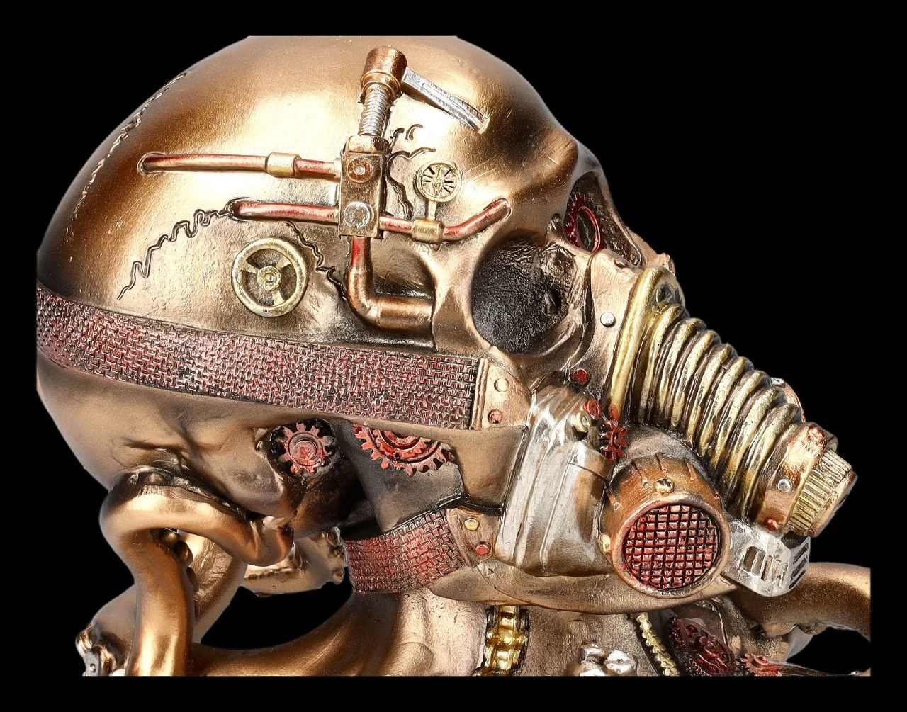Die Krake mit der Gasmaske ist eine absolut faszinierende Deko für alle Technik- und Steampunk-Fans. Zahnräder, Schrauben, Muttern und vieles mehr lassen die Krake mit dem Totenschädel aussehen, als wäre sie magnetisch durch eine Werkstatt gerauscht. Der 15 cm hohe, 16 cm breite und 18 cm tiefe Steampunk-Totenkopf mit den Krakententakeln wurde detailreich aus handbemaltem Kunststein (Polyresin) gefertigt und ist damit auch ein durchaus fantasievolles Geschenk.