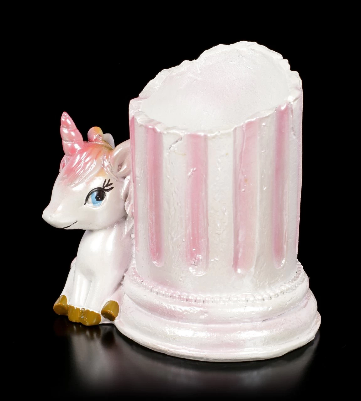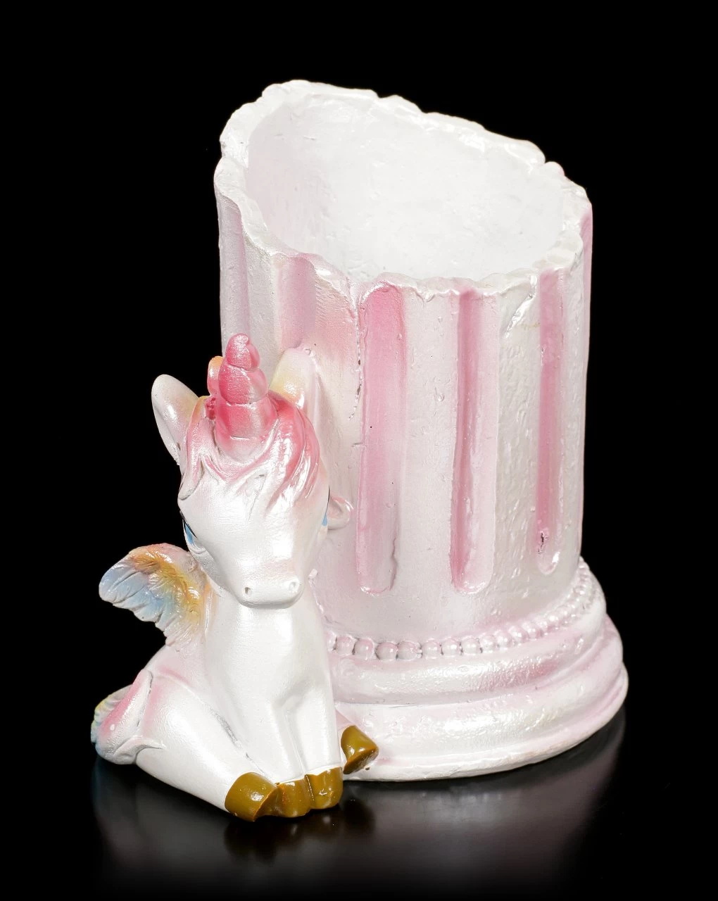 Sind Sie ein Einhorn Fan? Oder haben Sie eine Tochter, die auf die süßen Fabeltiere steht? Das kleine geflügelte Regenbogen-Einhorn hat es sich vor einer Säule bequem gemacht. Die Säule ist innen hohl und kann als Stiftebecher genutzt werden. Ist das nicht umwerfend? Der niedliche Stiftebecher aus handbemaltem Kunststein (Polyresin) wird ohne die Stifte geliefert.