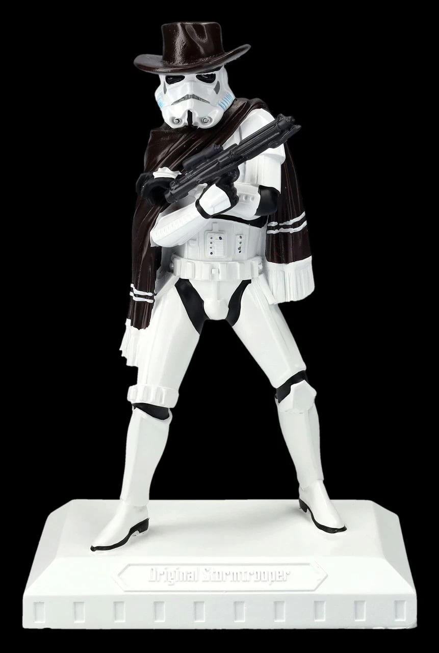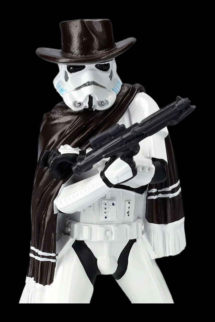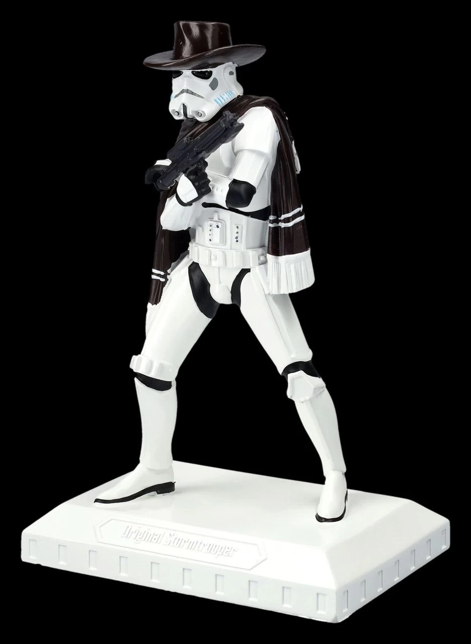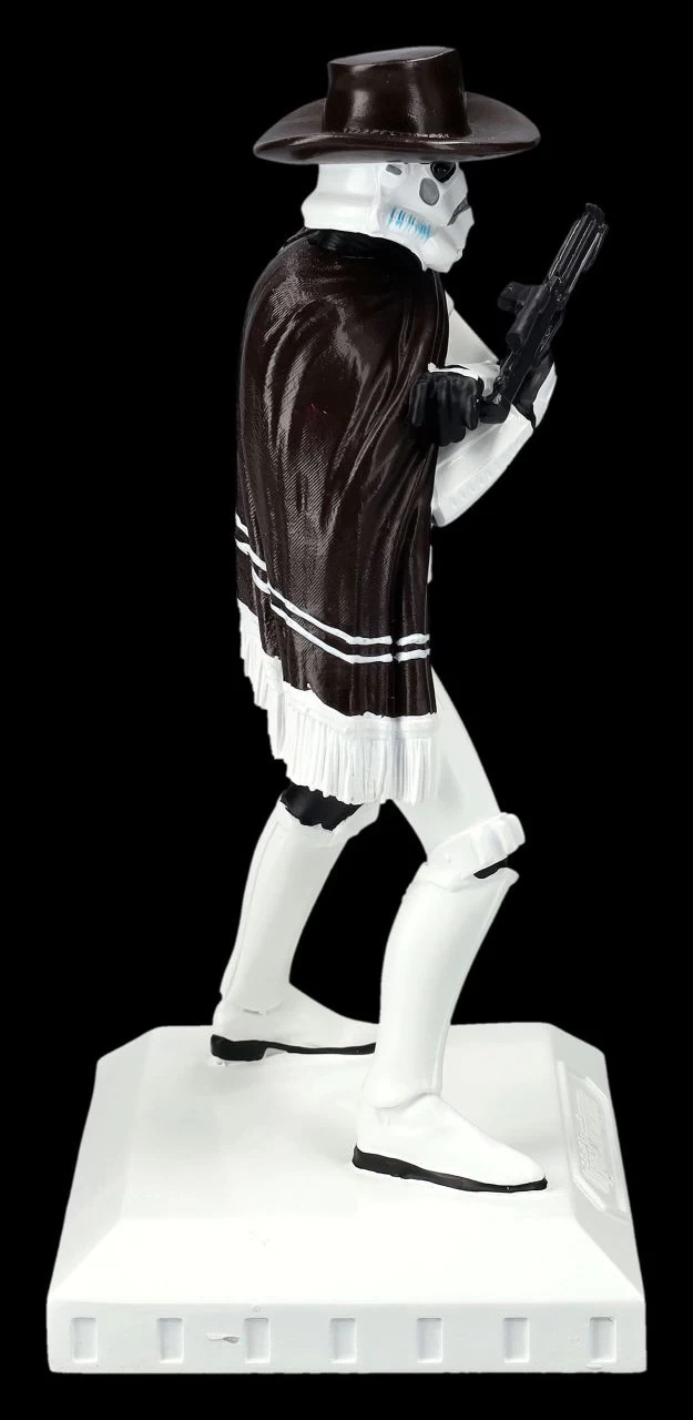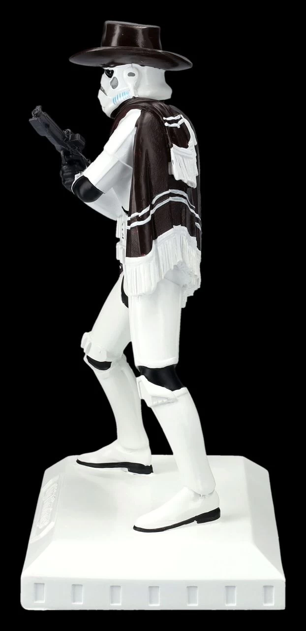 The Good The Bad The Trooper – diese fantastische Stormtrooper-Figur sieht mit dem Poncho, dem Westernhut und dem Blaster aus, als wäre er aus einem der witzigen Western aus den 60er Jahren entsprungen. Auch die Haltung passt perfekt zu dem Eindruck. Um die Erde und die Bewohner kennen zu lernen, gab es als Schulungsprogramm anscheinend alte Western. Als offiziell lizenziertes Stormtrooper Merchandise darf ‚The Good The Bad The Trooper‘ wahrlich in keiner Sammlung fehlen. Die 18 cm hohe, 12 cm breite und 8,5 cm tiefe Stormtrooper-Figur wurde aus hochwertigem Kunststein (Polyresin) gefertigt und von Hand bemalt. Sie ist genau das richtige Geschenk für alle Stormtrooper-Fans und kommt in einem Geschenkkarton.