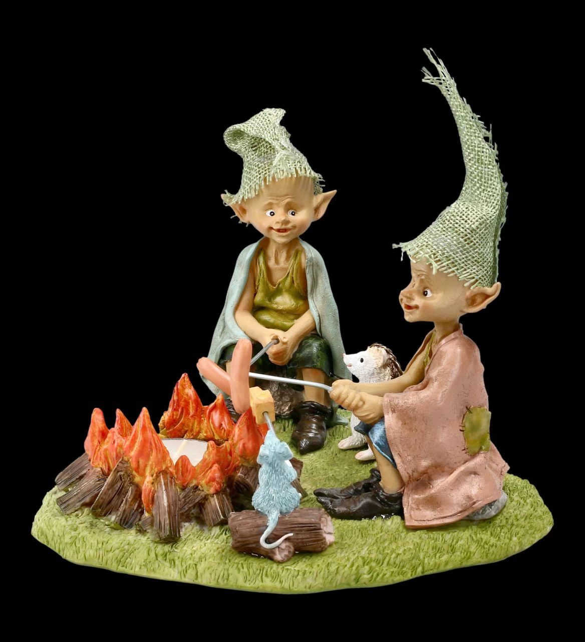 Die vier Freunde sitzen am Lagerfeuer und erzählen sich ihre Abenteuer. Während die beiden frechen Kobolde ihre Würstl an den Spießen ins Feuer halten, hat sich die Maus lieber ein Stück Käse aufgespießt. Nur der Igel wartet darauf, von wem er nun etwas zum Futtern bekommt. Das Teelicht in der Mitte beleuchtet die Szene. Die lustigen Pixie Kobold Figuren am Lagerfeuer sind bis ins kleinste Detail liebevoll handbemalt und aus Kunststein (Polyresin) gefertigt. Der Teelichthalter mit den Kobolden, der Maus und dem Igel ist 13,5 cm hoch, 18 cm breit und 18 cm tief und nicht nur für Sammler von Pixie-Figuren ein besonderes Geschenk. In unserem Shop gibt es übrigens noch weitere lustige Pixie-Kobolde.