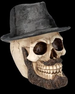 Hut und Bart sind dem unglaublichen, knöchernen Totenschädel anscheinend geblieben. So sieht er immer noch wie ein gut erhaltener Gentleman aus. Der 16,5 cm hohe, 14,5 cm breite und 17 cm tiefe Totenkopf mit Hut und Bart ist detailreich aus Kunststein (Polyresin) gefertigt. Der etwas exzentrische Totenkopf ist sorgsam von Hand bemalt und wird mit Sicherheit auch Sammler begeistern. Er ist aber auch ein perfektes Geschenk für den Mann mit Chic und Charme.