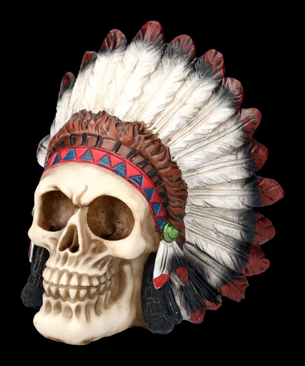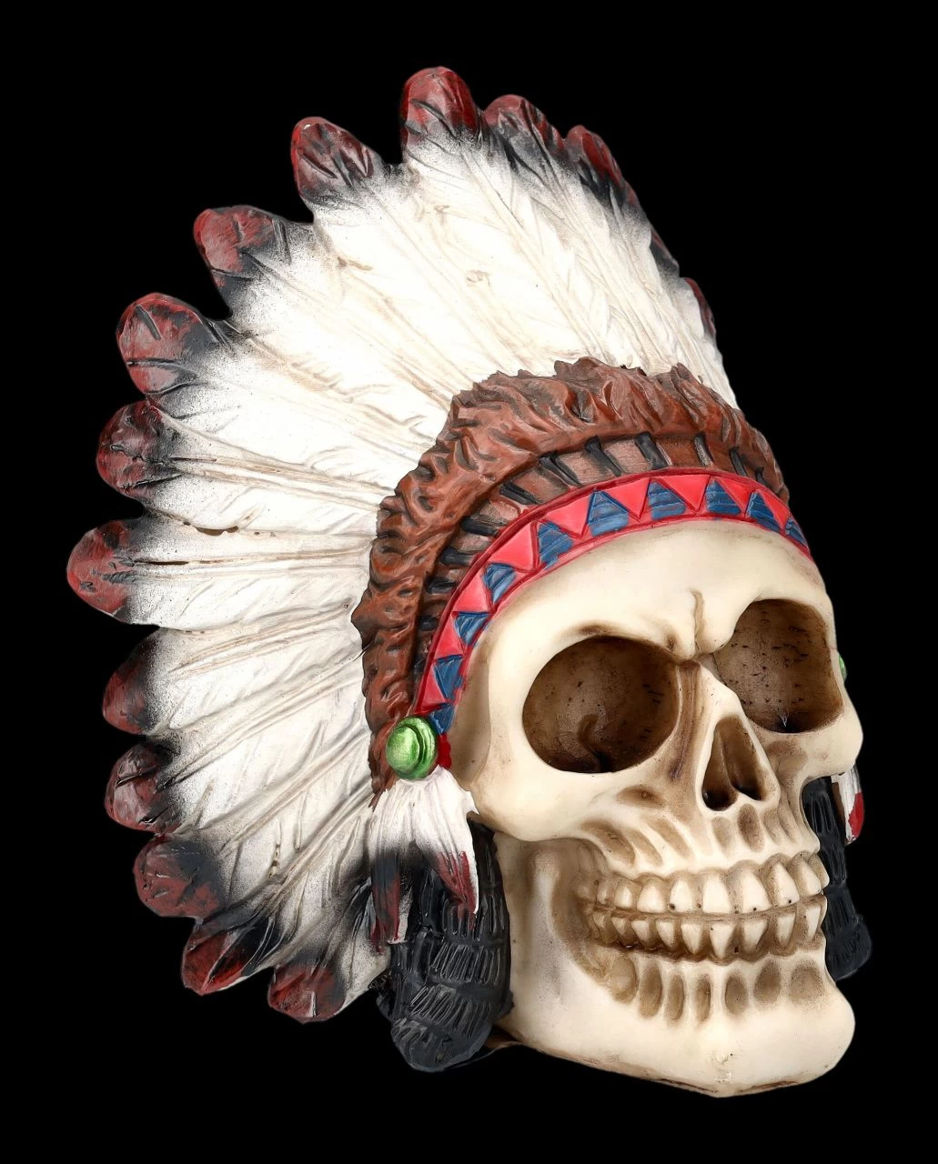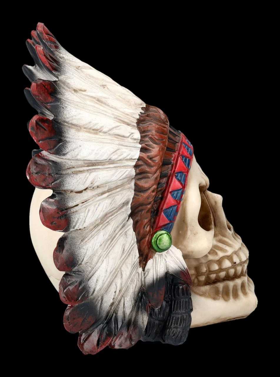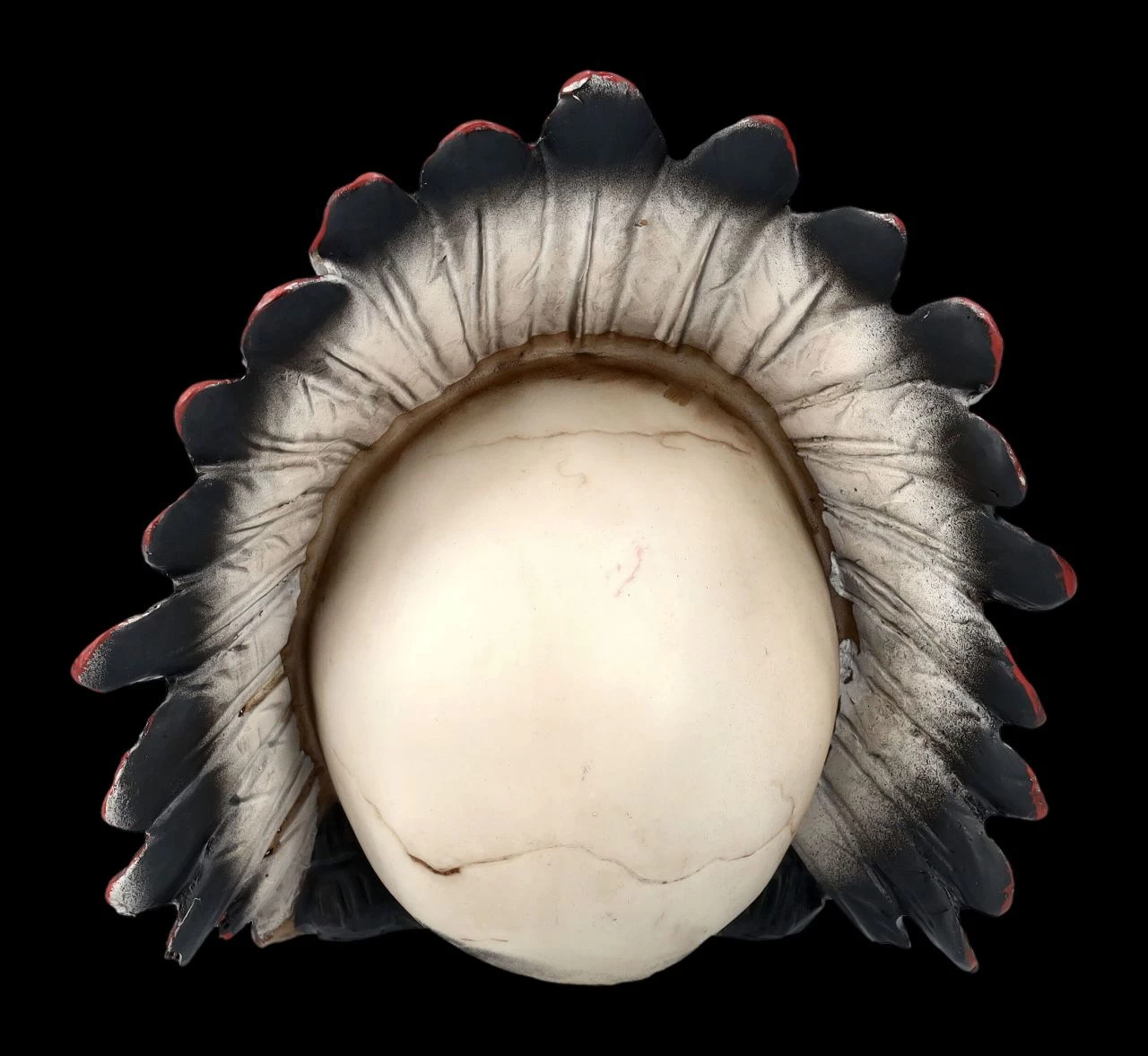 Das war der große Häuptling der Indianer…. Erstaunlich, dass der beeindruckende Federschmuck sogar den Tod überdauert. Der fantastische Totenkopf eines Indianer-Häuptings im großen Federschmuck ist 14 cm hoch, 14,5 cm breit und 11 cm tief. Er wurde aus aufwändiig handbemaltem Kunststein (Polyresin) gefertigt und wird sicher nicht nur bei Indianer-Fans großen Eindruck hinterlassen.