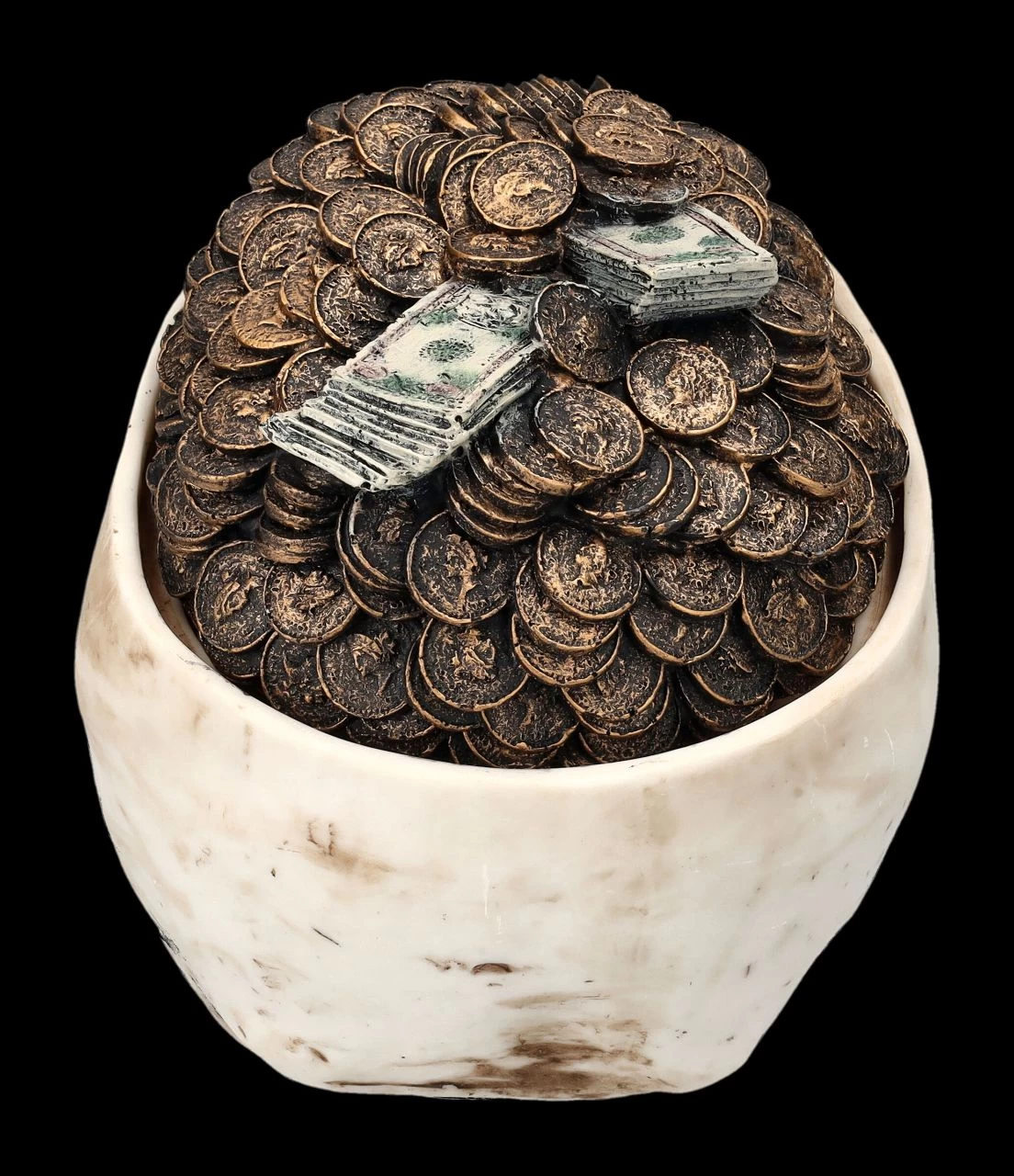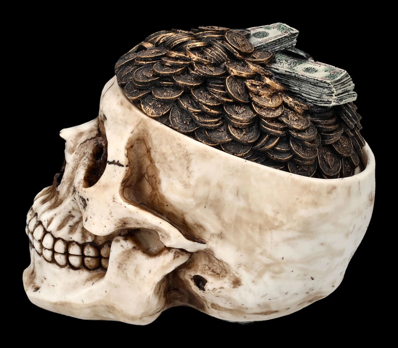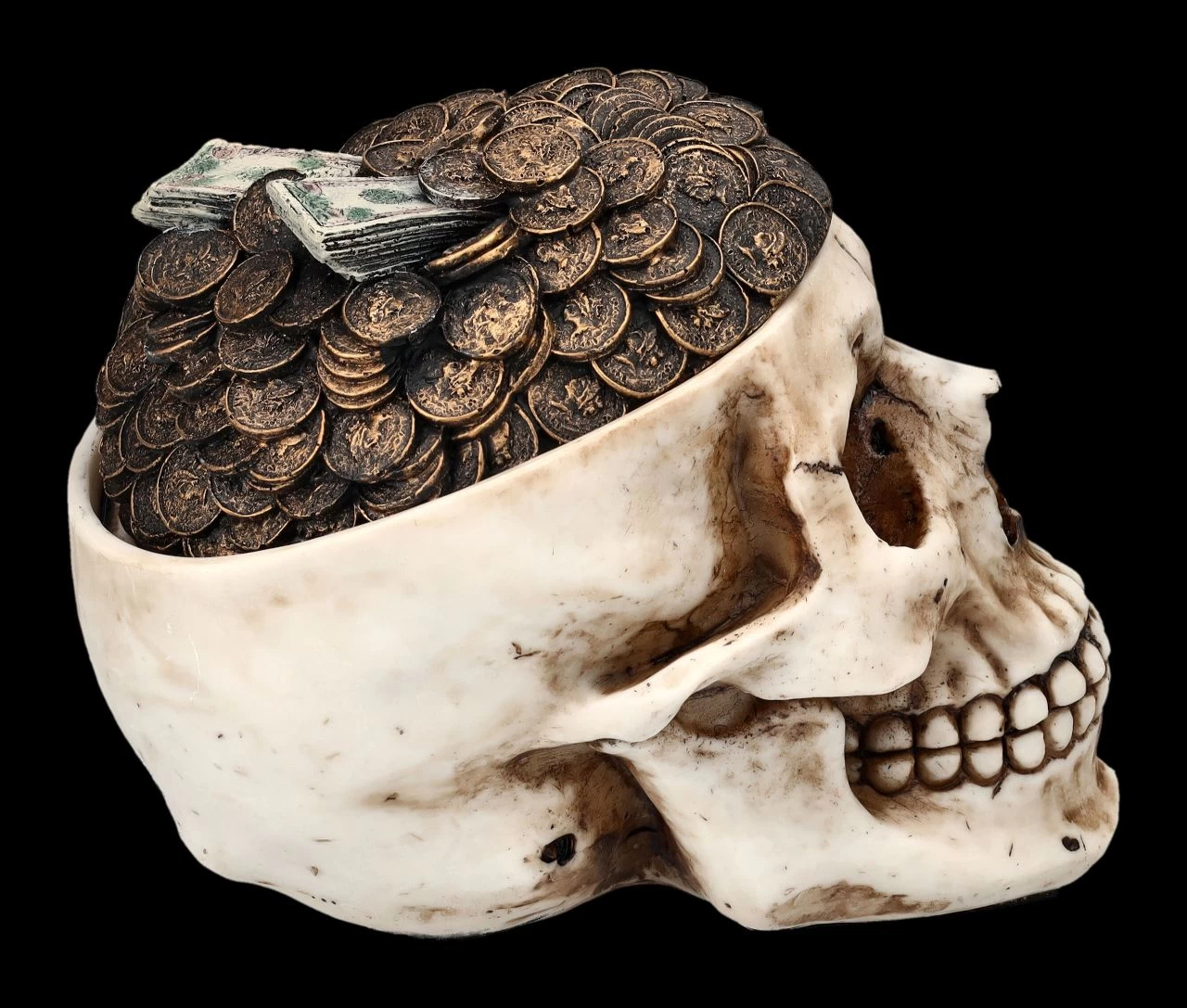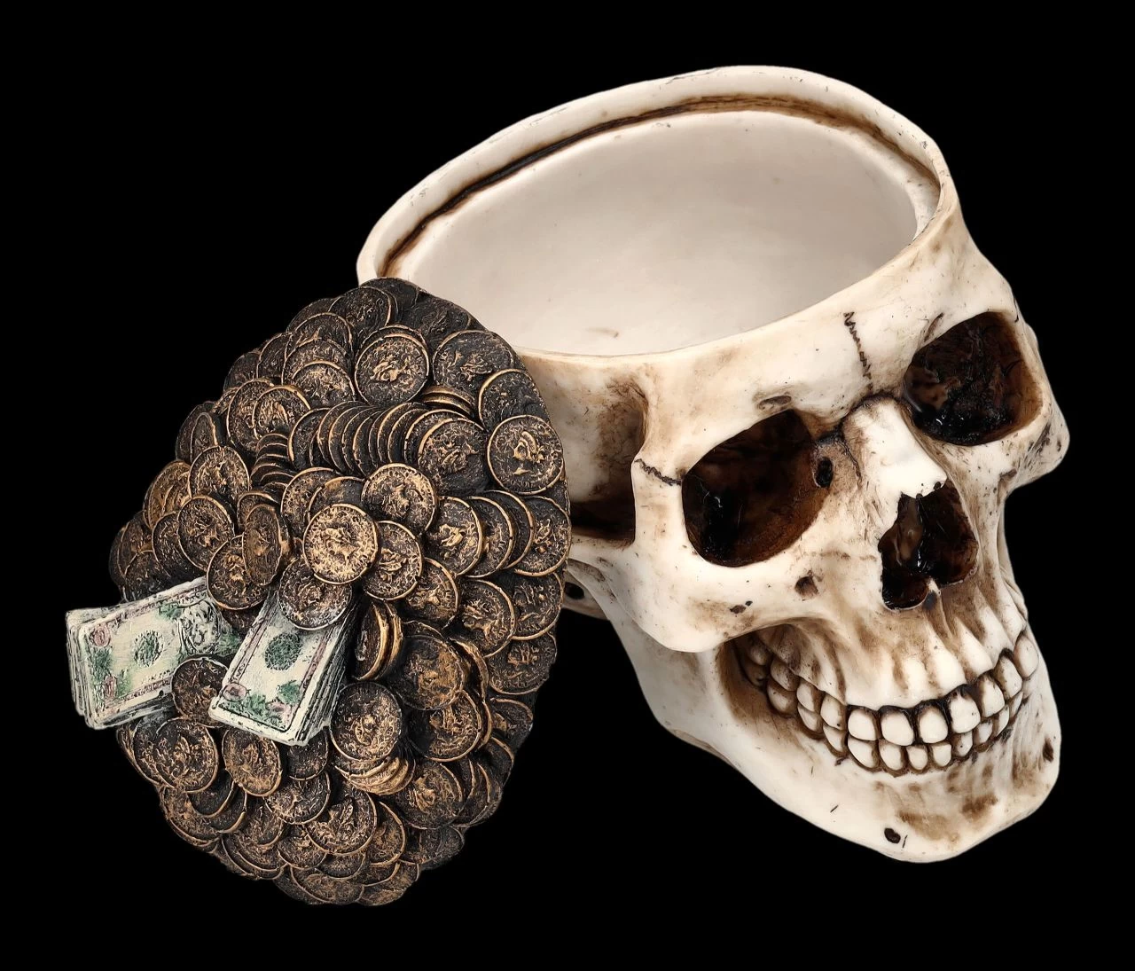 Hoffentlich kommt niemand in Versuchung, die Schädeldecke dieses Totenkopfes abzuheben, denn dann entdeckt er die geheimnisvolle Schatulle darunter, in der man perfekt Münzen oder andere kleine Kostbarkeiten aufheben kann. Aus der Schädeldeckel des Totenkopfes scheint ein Haufen Geld in Form von Scheine und Münzen hervorzuquellen. Die zahlreichen Details der knochenfarben handbemalten Schädelschatulle aus Kunststein (Polyresin) sind einfach faszinierend. Der 13 cm hohe, 11 cm breite und 16 cm tiefe Schädel hat innen eine Öffnung mit den Maßen H 7 cm x B 6 cm x T 10 cm für besondere kleine Kostbarkeiten.