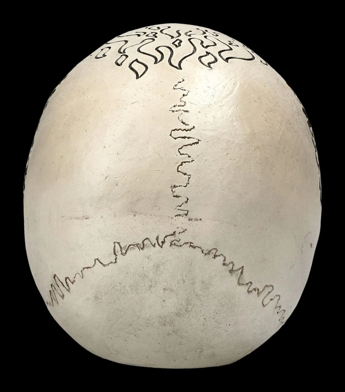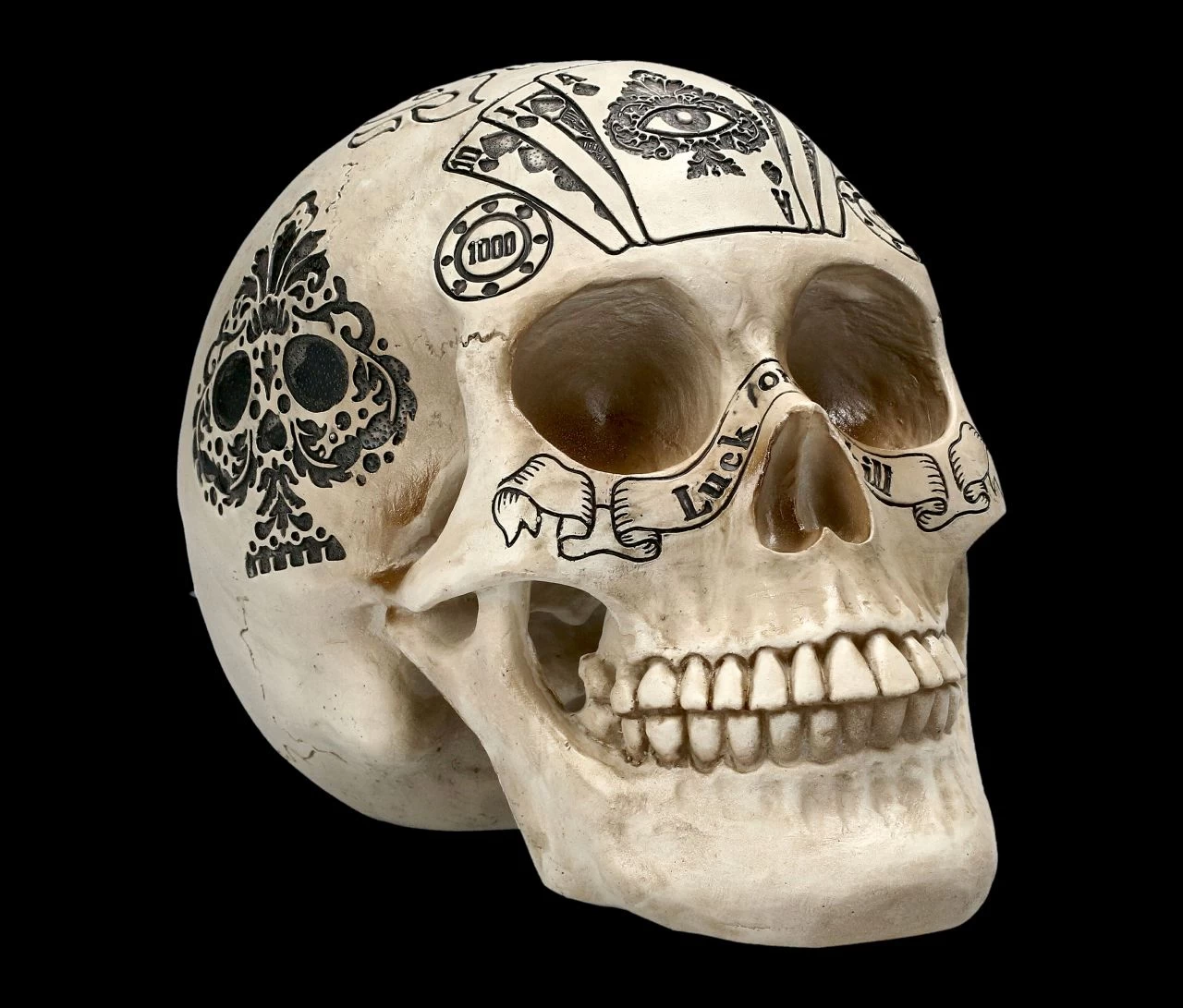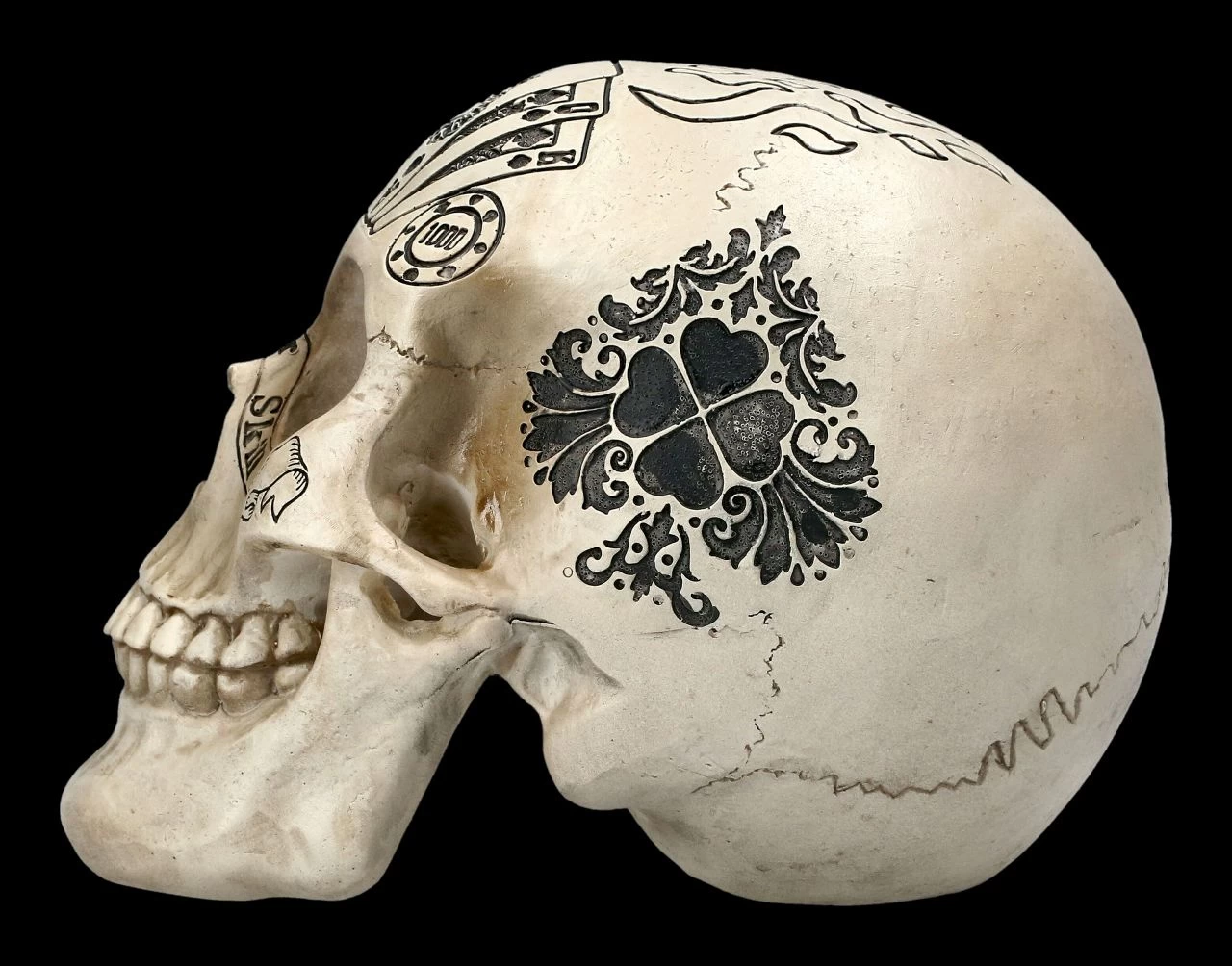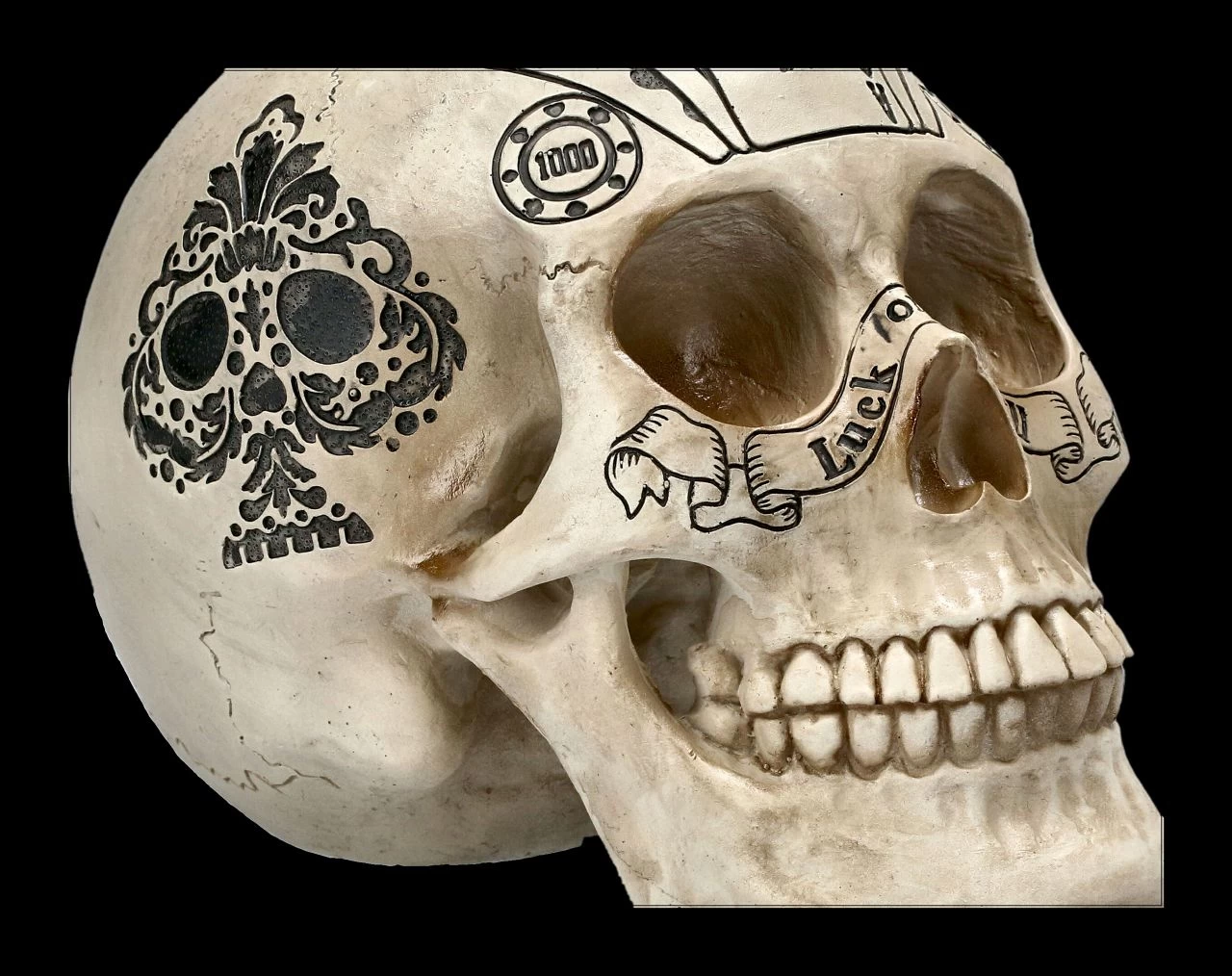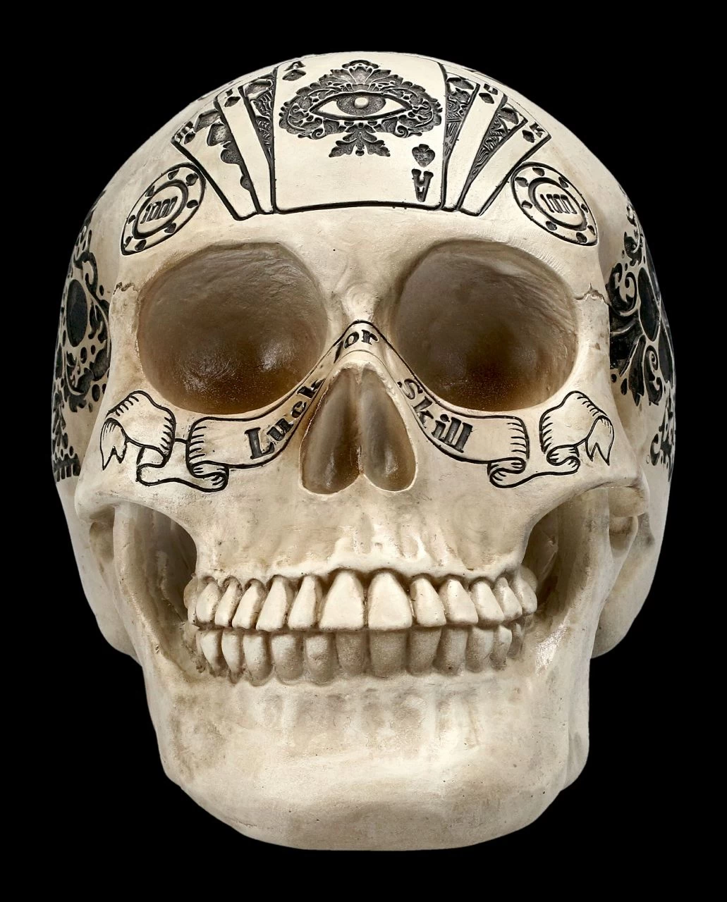 Pokerspieler aufgepasst – denn dieser mit den Karten eines Royal Flush handbemalte Totenschädel zeigt das zufriedenste Pokerface und in der Banderole über der Nase steht als Erklärung ‚Glück für Geschicklichkeit‘. Der coole Totenschädel ist sorgsam aus Kunststein (Polyresin) gefertigt. Er ist 12,5 cm hoch, 12 cm breit und 16,5 cm tief. Der Totenschädel mit dem Royal Flush ist sicher der absolute Hingucker auf jedem Pokertisch.