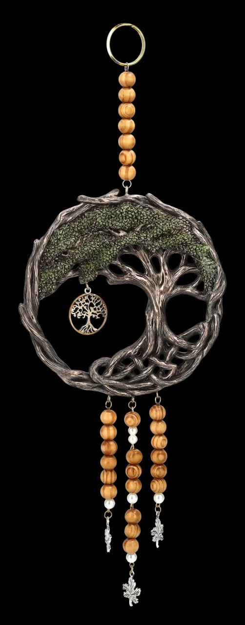 Die Wurzeln von Yggdrasil, der Weltesche aus der nordischen Mythologie, bilden bei diesem wunderschönen Traumfänger einen Kreis, der den germanischen Lebensbaum umrahmt. Das in den Zweigen hängende Medaillon zeigt ebenfalls den Lebensbaum. Der wunderbare, 32,5 cm hohe, 12,5 cm breite und 1,5 cm tiefe Traumfänger aus der Studio Collection von Veronese ist außerordentlich detailreich aus Kunststein (Polyresin), Metall, Holz und Holzperlen gearbeitet. Er wirkt auch durch die Bronzierung und feine Colorierung sehr effektvoll und dekorativ. Der außergewöhnliche Traumfänger ist auch ein sehr schönes Geschenk