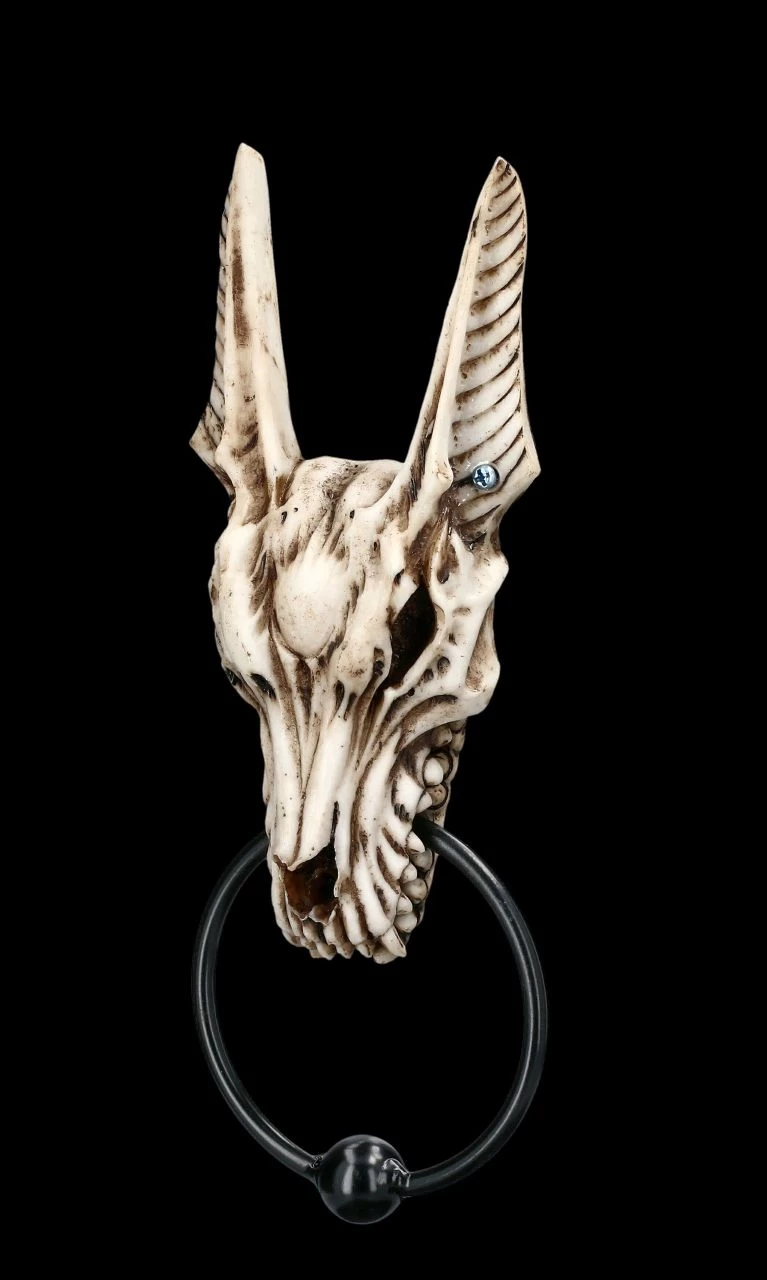 Hier wird jeder Ihrer Besucher Augen machen und mit Sicherheit, anstatt einfach nur zu klingeln, mit diesem unglaublichen Türklopfer Einlass begehren. Der fantastische Türklopfer mit dem Anubis Totenkopf ist sorgsam aus handbemaltem Kunststein (Polyresin) und Metall gefertigt. Mit der Höhe von 25 cm, der Breite von 10 cm und der Tiefe von 5 cm wird der Anubis Totenkopf zum auffälligen Element an Ihrer Tür.