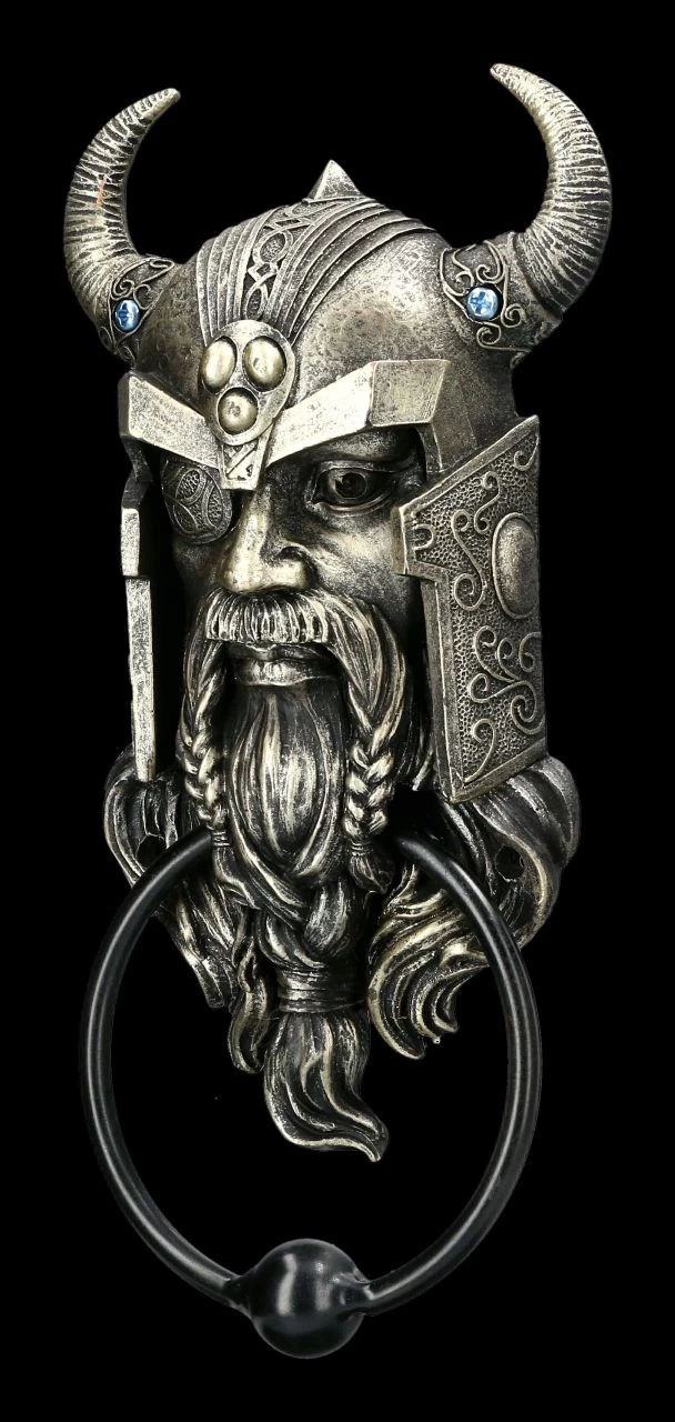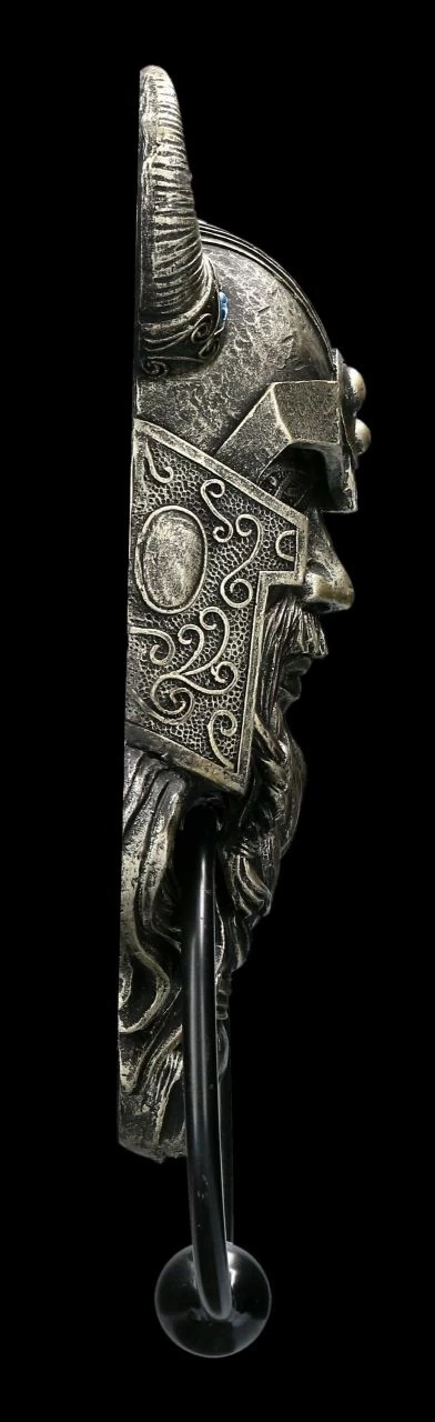 Etwas Mut und Selbstvertrauen gehört schon dazu, wenn man es wagt, unter dem beobachtenden Blick des Gottes Odin den Türklopfer zu bewegen. Der fantastische Türklopfer mit dem germanischen Gott ist beeindruckend detailreich aus handbemaltem Kunststein (Polyresin) und Metall gefertigt. Falls Sie ihn nicht an Ihrer Haustür anbringen können, so bewacht er mit seiner Höhe von 23 cm, der Breite von 11,5 cm und der Tiefe von 4 cm auch perfekt eine Tür zu Ihrem sehr persönlichen Bereich in Ihrem Zuhause.