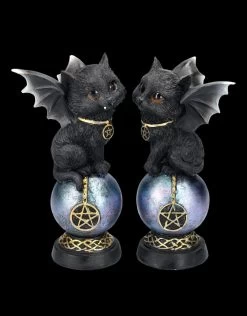 Wer fürchtet sich vor der Zukunft, wenn sie von den beiden, auf der Wahrsagerkugel sitzenden schwarzen Vampirkatzen vorhergesagt wird? Wohl sicher niemand, denn die beiden sind nicht nur absolut niedlich anzusehen, sondern tragen auch noch ein Pentagramm als Schutzamulett um den Hals. Und auch an der Wahrsagerkugel hängt ein Pentagramm als Schutzsymbol. Die niedlichen Vampirkatzen auf der Wahrsagerkugel wurden aus liebevoll handbemaltem Kunststein (Polyresin) gefertigt und kommen im 2er Set. Sie sind je 19 cm hoch, je 10 cm breit und je 8 cm tief und ein fantasievolles Geschenk, das man sogar mit Hexenfreunden teilen kann.