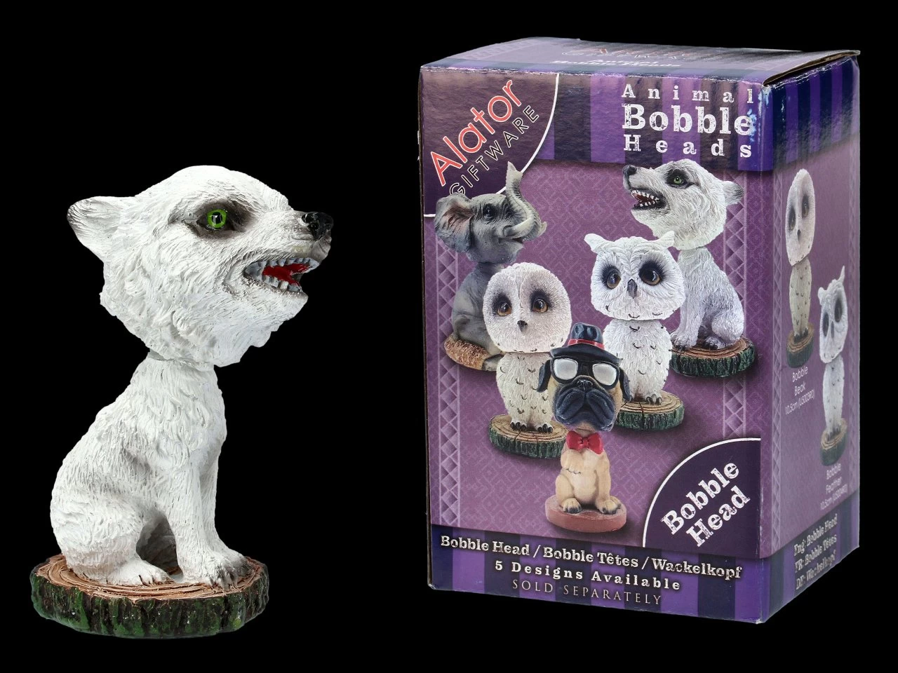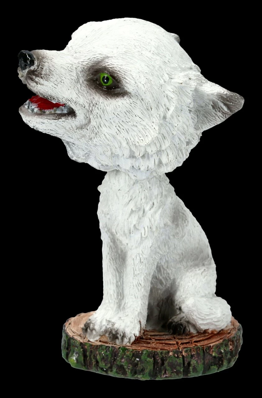 Wenn das süße weiße Wolfsbaby lustig mit seinem großen Kopf wackelt, zaubert es auch im Winter sicher jedem ein Lächeln ins Gesicht. Das Winter Wolf Junge aus Kunststein (Polyresin) ist liebevoll handbemalt und 10 cm hoch, 6 cm breit und 7,5 cm tief. Mit seinem großen Wackelkopf ist es auch ein niedliches Geschenk und wird inklusive Geschenkverpackung verschickt.