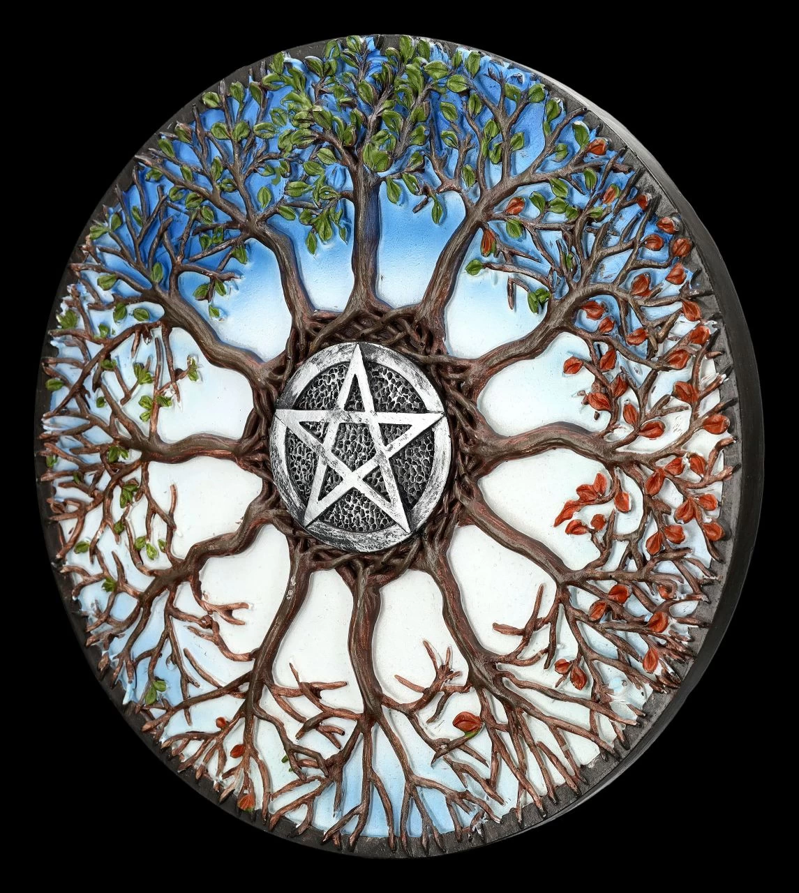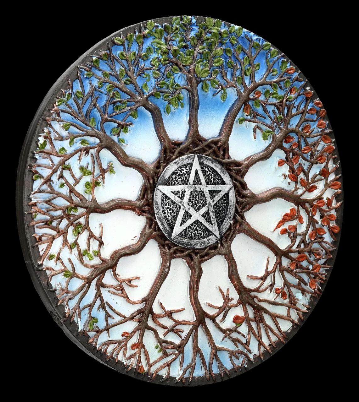 Der Lebensbaum, der für Entwicklung, Wachstum, Fruchtbarkeit, Unsterblichkeit und Heilung steht ist auf diesem fantastischen Wandrelief vor leicht bewölktem blauen Himmel in den Farben der Jahreszeiten zu sehen. Das Zentrum in der Mitte bildet ein Pentagramm als eines der mächtigsten Schutzsymbole Das wunderbare Wandrelief hat einen Durchmesser von 19,5 cm und eine Tiefe von 1,5 cm. Es wurde sorgfältig aus Kunststein (Polyresin) gefertigt und liebevoll handbemalt. Das fantastische Wandrelief mit dem magischen und spirituellen Symbol des Lebensbaumes im Zeichen der Jahreszeiten ist zum Hängen. Es ist nicht nur eine faszinierende Deko, sondern auch ein wunderbares Geschenk für einen lieben Menschen..