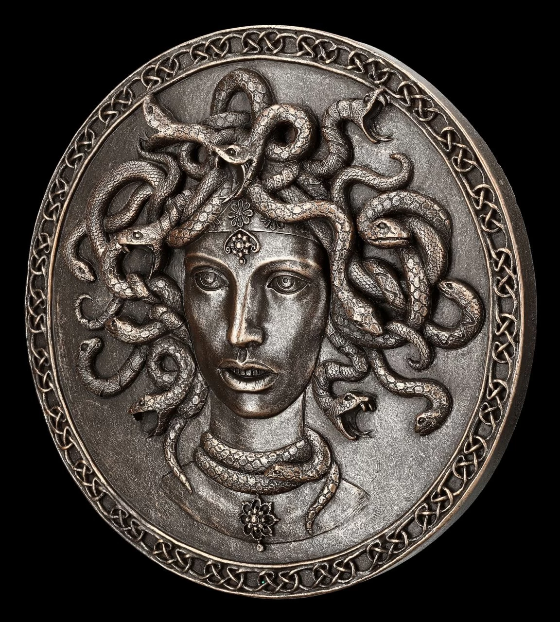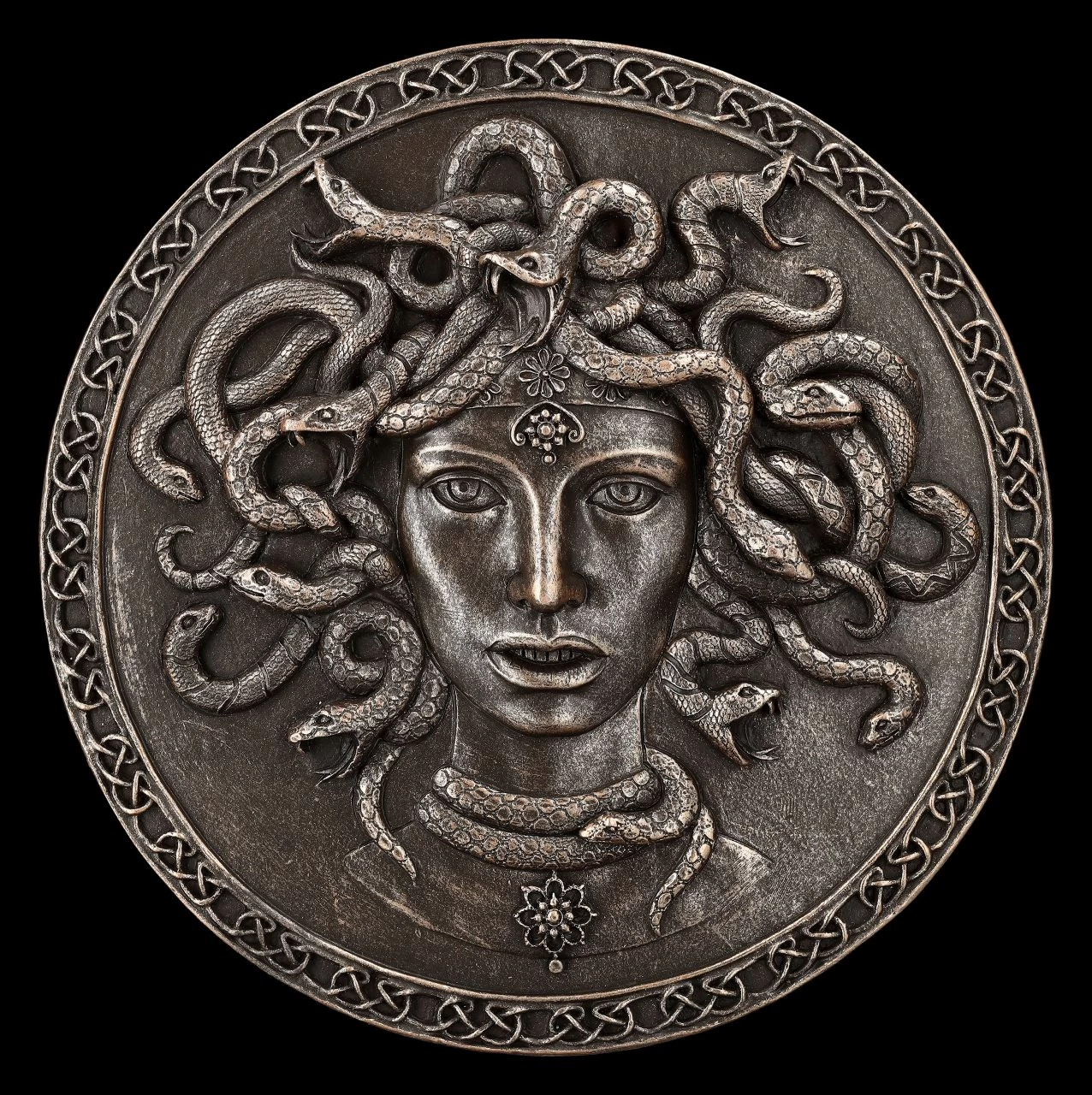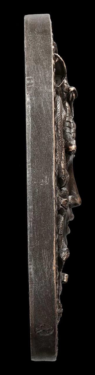 Medusa ist uns allen aus zahlreichen Darstellungen bekannt. Sie war in der griechischen Mythologie eine der drei schönen Gorgonen und Priesterin im Tempel der Göttin Athene. Von Poseidon begehrt und nach ihrer Weigerung von ihm vergewaltigt, wurde sie – und nicht Poseidon – von Athene aus dem Tempel geworfen und verwünscht. Angeblich war sie mit ihrem Schlangenhaupt dann so häßlich, dass jeder versteinerte, der sie erblickte. Ausgerechnet Athene hatte dann Perseus ein glänzendes Schild gegeben und ihm verraten, wie er Medusa besiegen kann, indem er ihr im Schild ihr eigenes Spiegelbild zeigte. Er schlug ihr den Kopf ab und brachte ihn Athene. Dieses Haupt mit den Schlangenhaaren wird mal als Fratze und mal als schöne Frau mit Schlangenhaupt dargestellt, wie bei diesem fantastischen Medusa-Schild mit Schlangenhaupt als Wandrelief. Eines haben die Darstellungen jedoch alle gemeinsam, Medusa blickt immer wütend, was allerdings kein Wunder ist. Das Wandrelief aus handbemaltem Kunststein (Polyresin) mit dem Durchmesser von 19,5 cm und der Tiefe von 1,5 cm ist zum Hängen. Es ist eine faszinierende Deko, die sofort jedem auffallen wird.