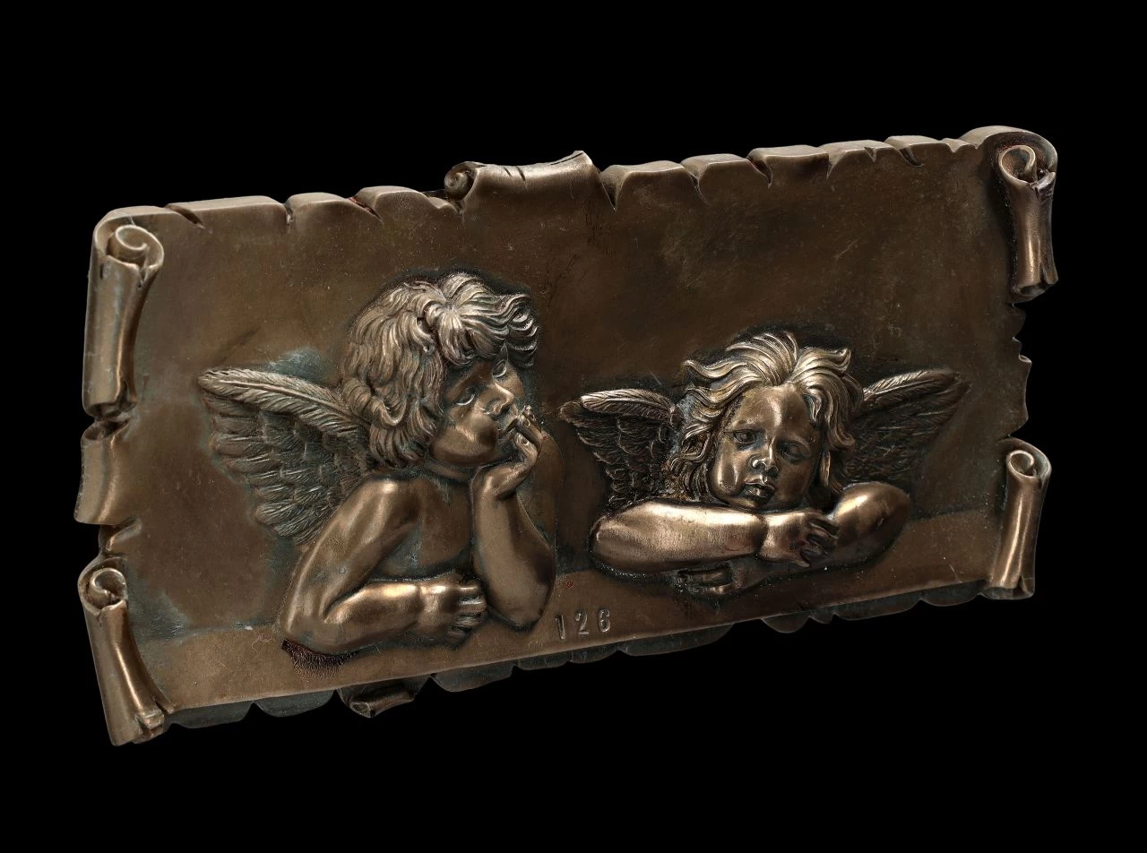Jeder kennt dieses Motiv. Aber auf diesem Wandrelief zeigt es auch, dass Engel für jeden da sind. Das wie eine Schriftrolle geformte Wandrelief mit den nachdenklichen Putten ist 9,5 cm hoch, 19 cm breit und 2 cm tief. Es wurde aus bronziertem Kunststein (Polyresin) gefertigt und ist auch ein wunderbares und beschützendes kleines Geschenk.
