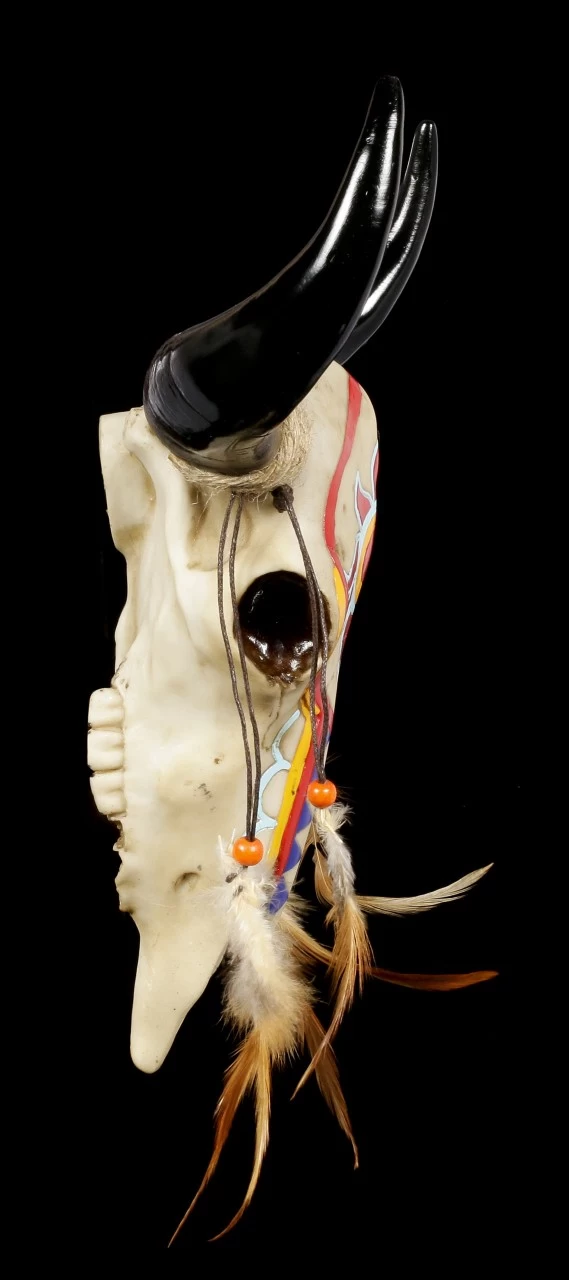 Sind Sie ein Western Fan? Mögen Sie die indianische Kunst? Oder sind Sie auf der Suche nach einer ungewöhnlichen Wanddeko? Dann ist der Stierschädel im Stil der indianischen Kunst aus handbemaltem Kunststein (Polyresin) perfekt für Sie! Der Schädel mit Sonnenmotiv lässt sich auch dekorativ auf einem Sideboard platzieren.