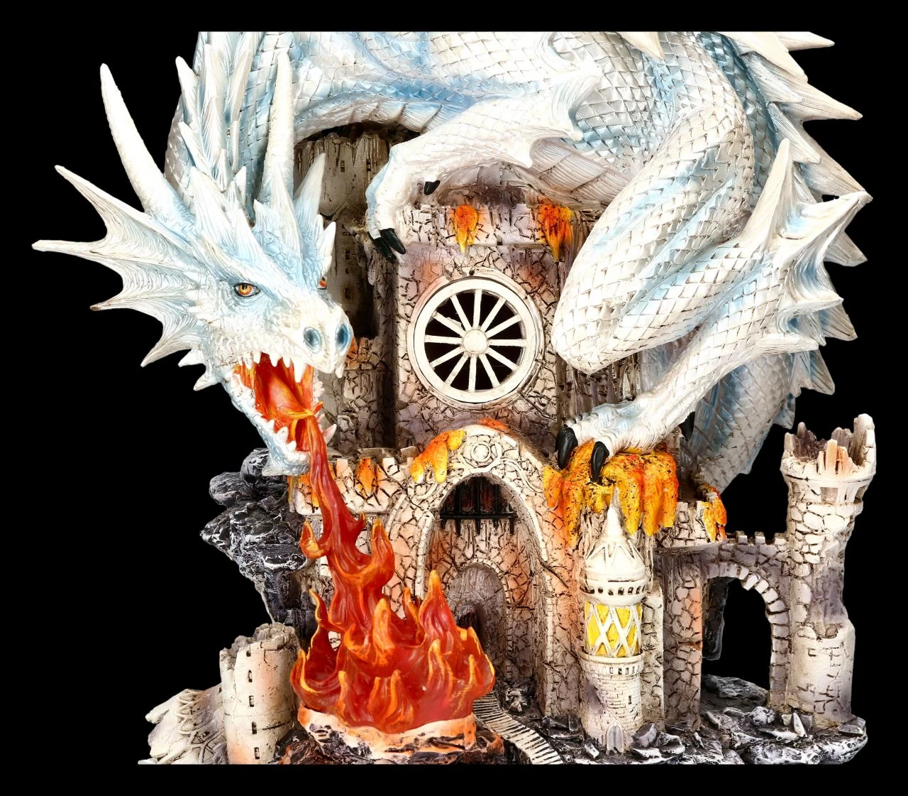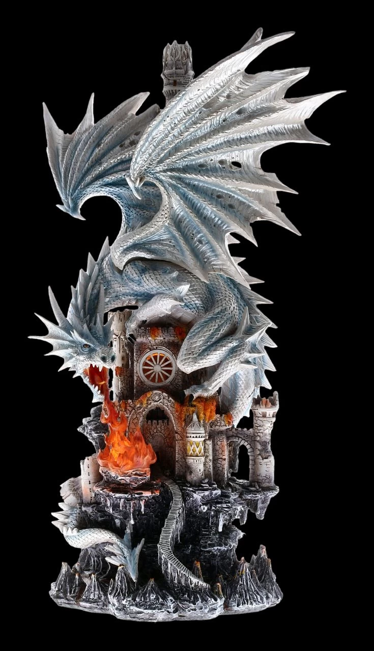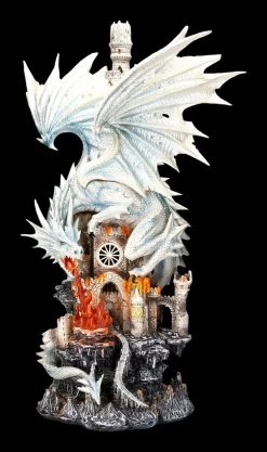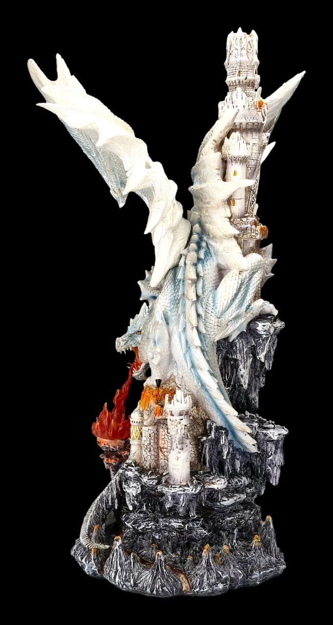Um noch furchteinflößender zu wirken, hat sich der große weiße Drache, die Flügel (sie sind zum Stecken) weit ausgestreckt, um den Burgturm gelegt und attackiert mit seinem feurigen Atem das Burgtor. Etwas muss ihn unheimlich wütend gemacht haben. Vielleicht ist er oder seine Familie vorher angegriffen worden, denn weiße Drachen gelten immerhin als äußerst selten. Die Burg und die imposante weiße Drachen-Figur sind äußerst detailreich aus Kunststein (Polyresin) gefertigt und mit viel Liebe zum Detail handbemalt. Durch die LED-Beleuchtung (der Schalter ist auf der Rückseite) wirkt alles noch beeindruckender und magischer. Die LED-Beleuchtung ist batteriebetrieben. Es werden 3 x AA-Batterien benötigt, die nicht inklusive sind. Für jeden, der es liebt, seiner Fantasie Raum zu geben, ist diese effektvolle Drachen-Figur eine wunderbare Dekrotation und das perfekte Geschenk für alle Drachen-Freunde.